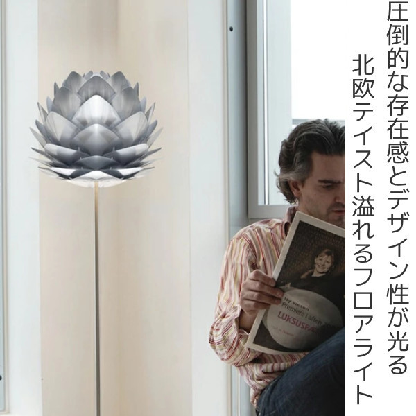 北欧ならではの植物的なモチーフとモダンデザインが融合したお洒落なフロアライトです。スチールのようなメタリックカラーが美しく、幾重にも重なった三角の羽が優しく幻想的なあかりを灯します。蓮の花や松ぼっくりに見えるデザインが電気をつけていない時でもお部屋のアクセントになります。