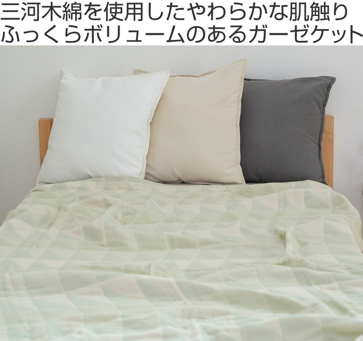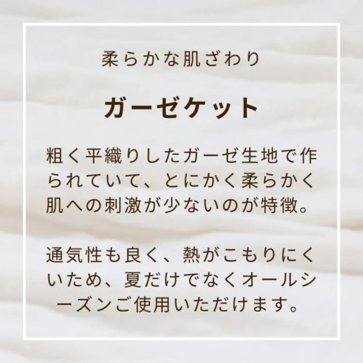 三河木綿を使用し、柔らかくさらっとした肌ざわりのガーゼケットです。やわらかなガーゼを6層に重ねることでふっくらボリュームをもたせました。