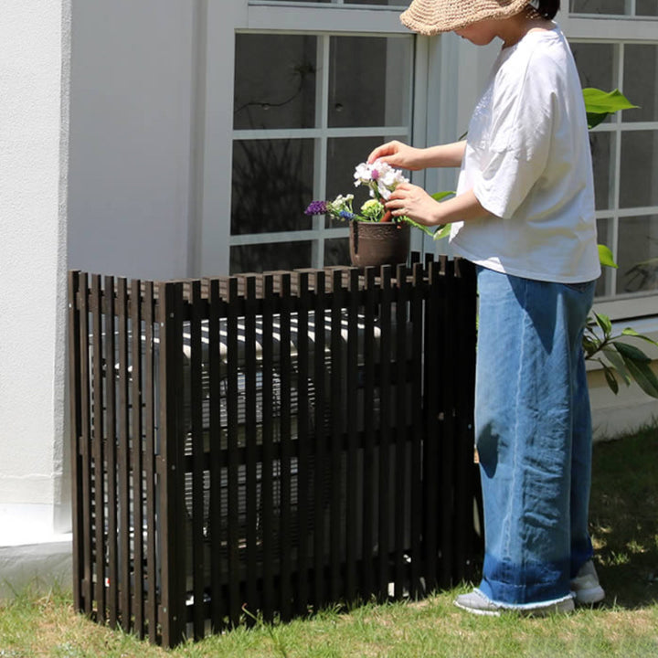 素朴な風合いと洗練されたデザインなので、無機質な室外機の雰囲気を明るくしてくれます。天然木を使用したモダンな縦格子は、通気性が良く、お庭の植物や外壁とも自然に馴染みます。和風の日本家屋にもよく合います。