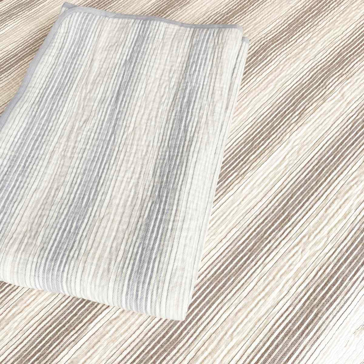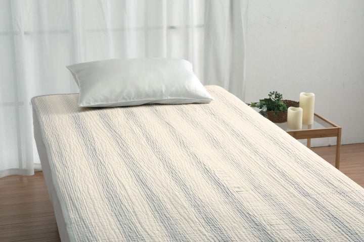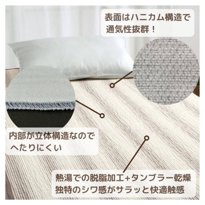 世界遺産「高野山」の麓、和歌山県高野口地域でのみ作られる特別な生地です。生地を約5分の4サイズに縮め、ふわふわでボリューム感が出るように仕上げています。吸湿性が高く、睡眠中の不快なムレ感が生じにくいことや、天然素材との相性がいいのが特長です。