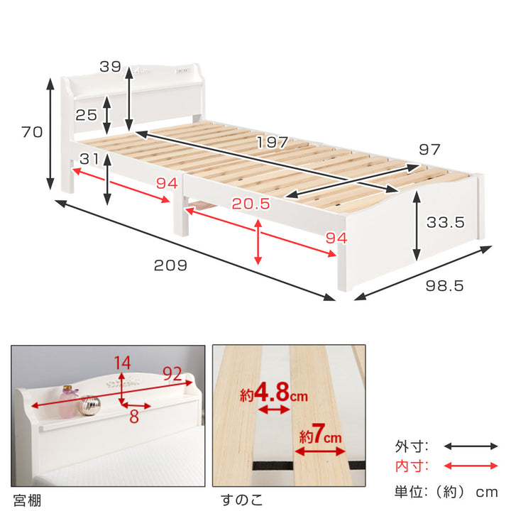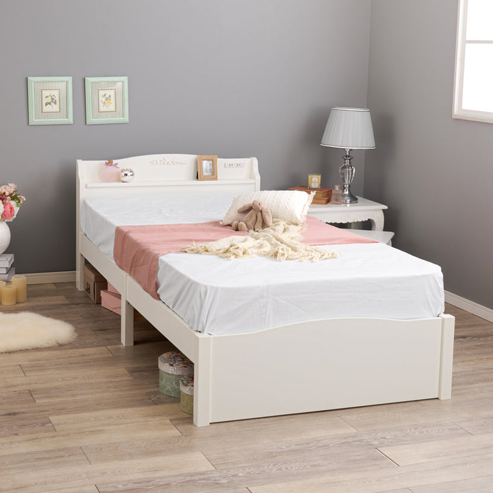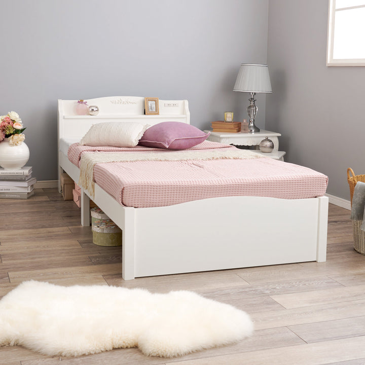 クラシカルなモチーフがあしらわれた上品な雰囲気の宮棚付きすのこベッドです。幅広い年代の方にお使いいただけるシンプルで上品なデザインです。マットレス付きなので届いたその日からお使いいただけます。