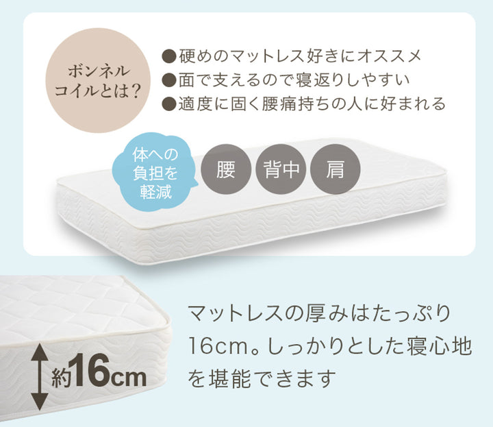しっかりとした寝心地の厚さ16cmのマットレス付きです。表面には、伸縮性に優れ身体に優しくフィットするニット生地を採用。面で支えるので寝返りがしやすく、適度に硬いので身体への負担を軽減します。
