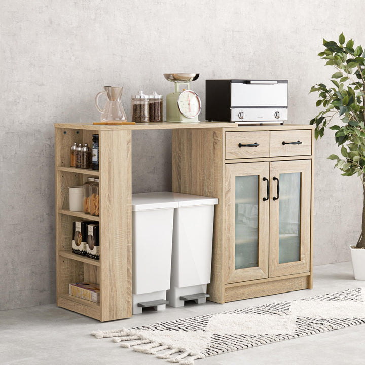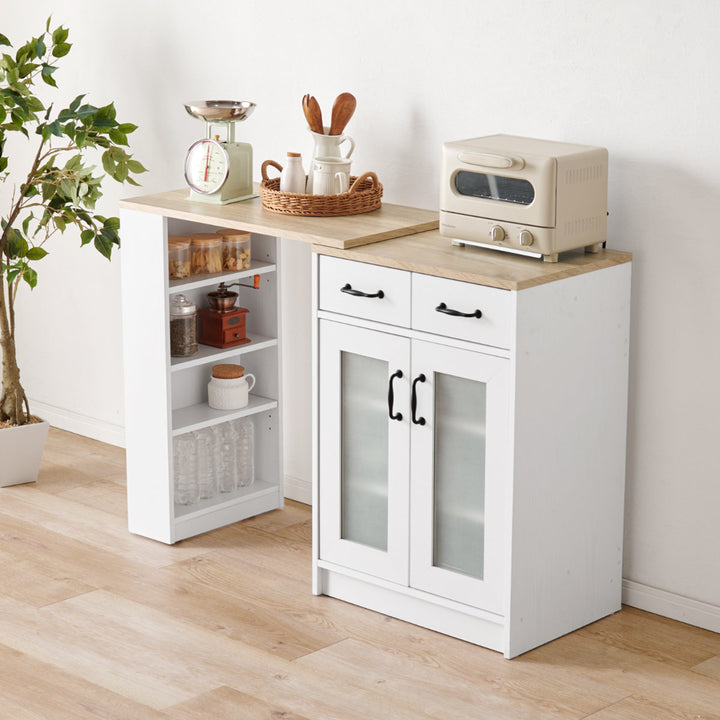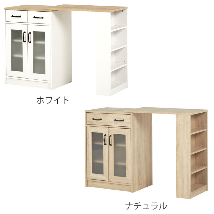 スペースに合わせて幅を調節できる伸縮キッチンカウンターです。コンパクトでありながら、食器やキッチン小物をひとまとめに収納することができます。