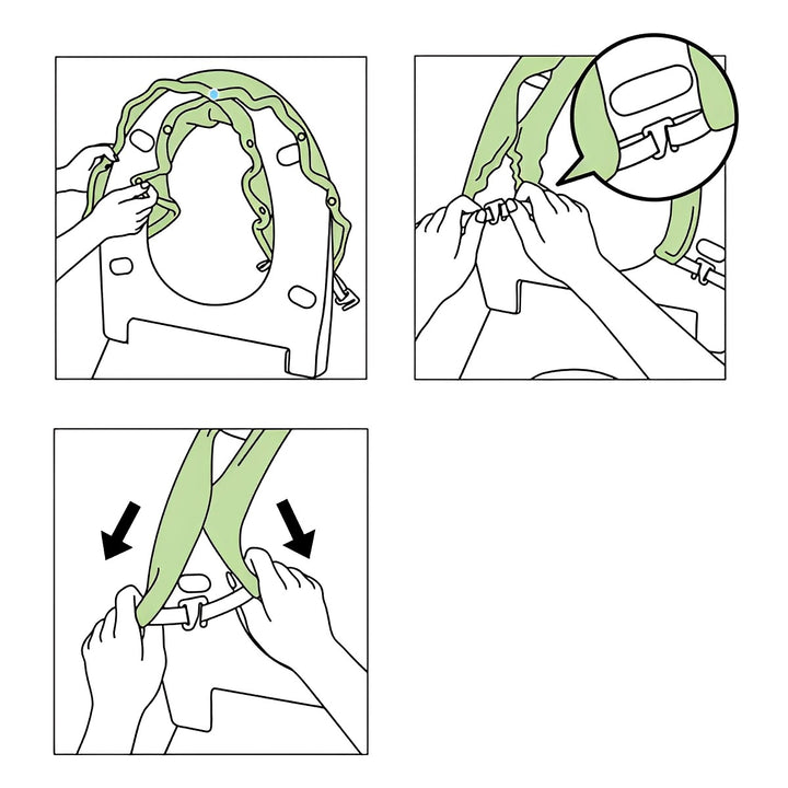 | 1、最初に真ん中ホックを便座の中央でとめ、他のホックをとめていきます。 |