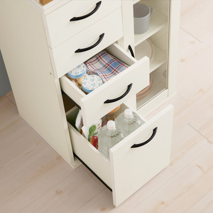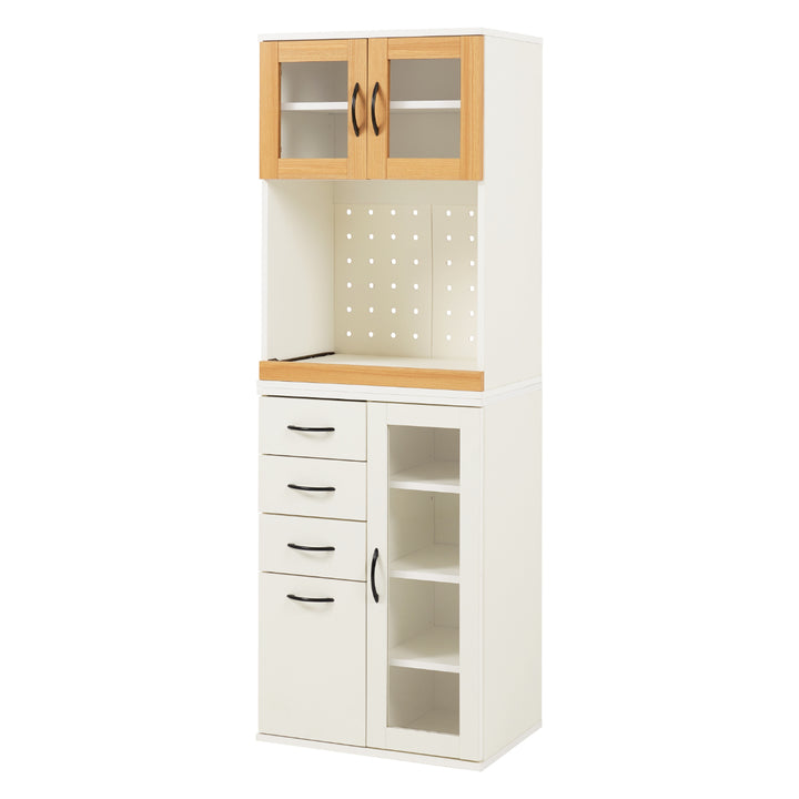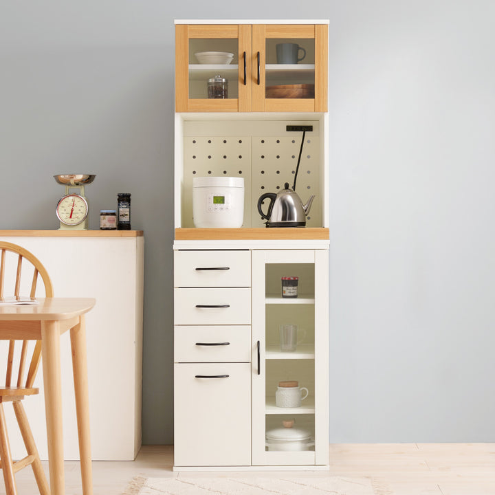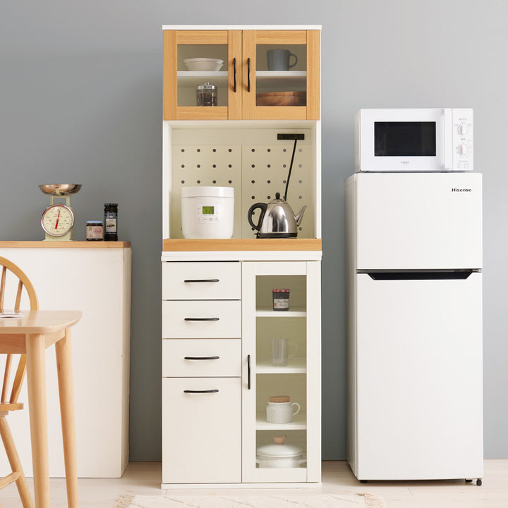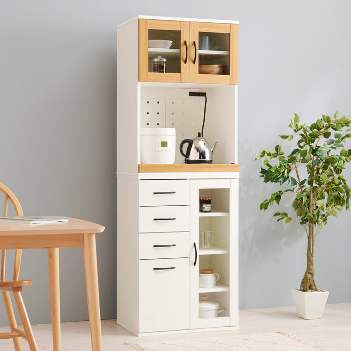 食器や家電、食品のストックをひとまとめに収納できる、バイカラーの食器棚です。高さのあるハイタイプで、デッドスペースを無駄なく活用できます。柔らかなベージュと爽やかなホワイトの2色が、優しい印象のナチュラルインテリアにおすすめです。