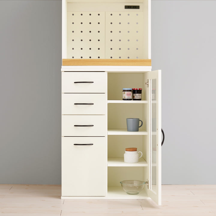 両開きの扉で間口が大きく開くので、大皿や鍋などスムーズに出し入れができます。中身が見えるガラス戸を採用しているので、どこに何があるのか一目で把握できます。