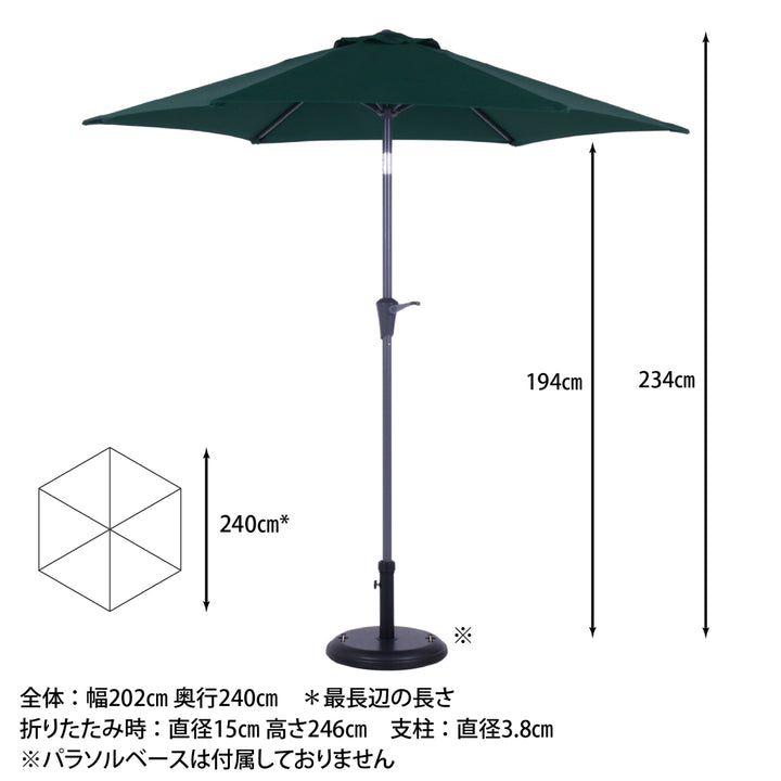 | サイズ | 約 幅202×奥行240×高さ234(cm) 親骨の長さ:122cm 展開時最長辺サイズ:約240cm 支柱直径:3.8cm |