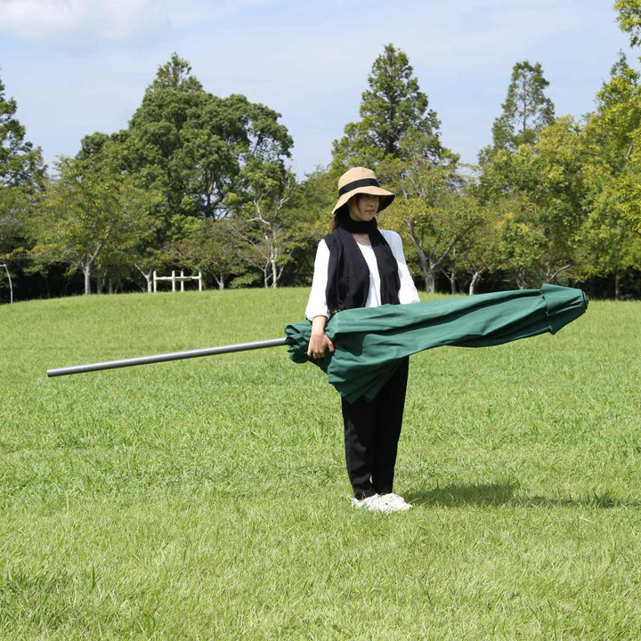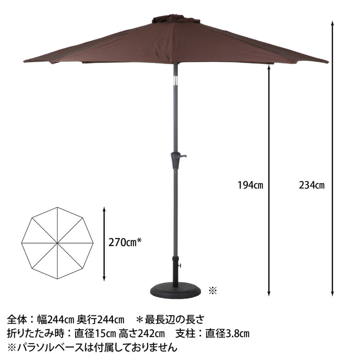 | サイズ | 約 幅244×奥行244×高さ234(cm) 親骨の長さ:137cm 展開時最長辺サイズ:約270cm 支柱直径:3.8cm |