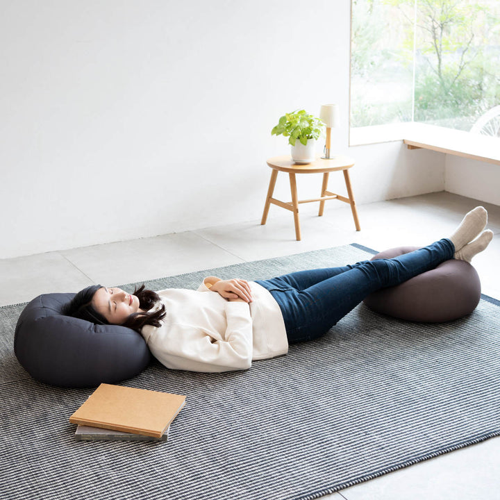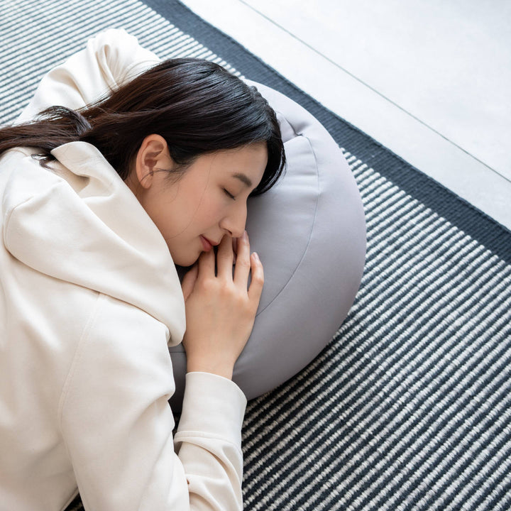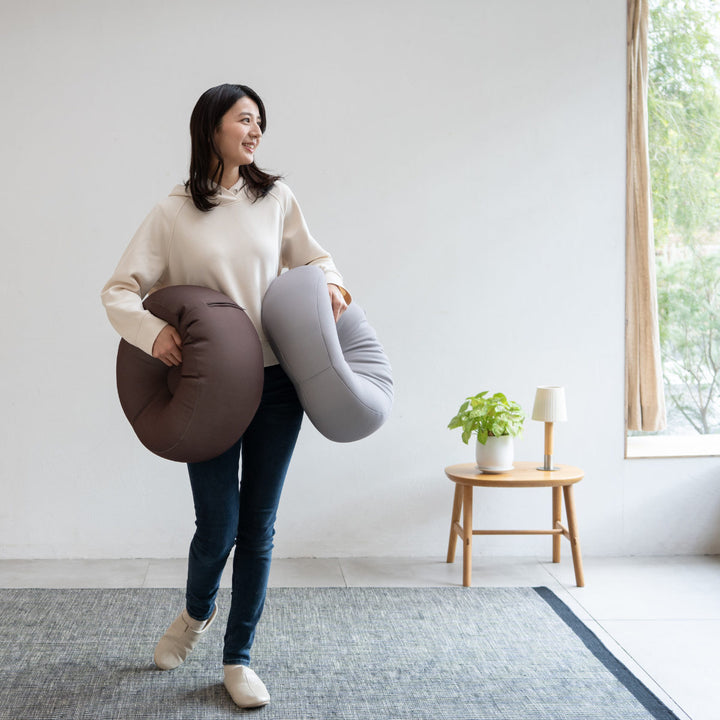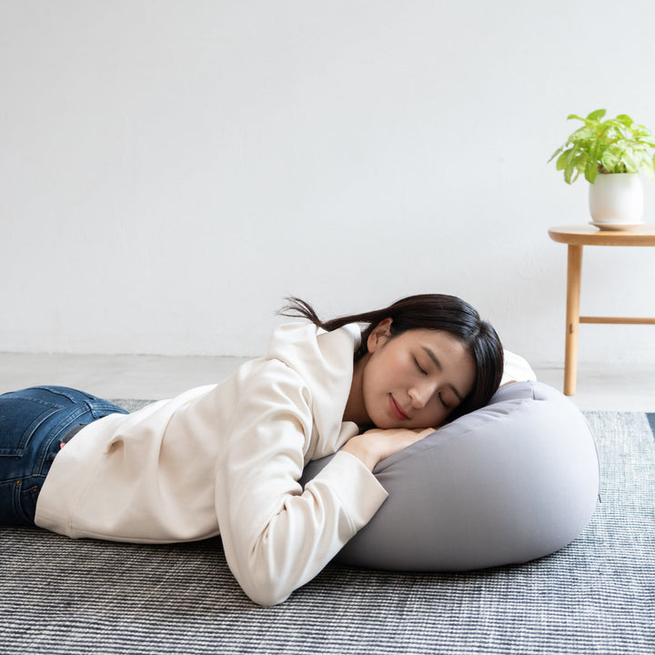 中心がくぼんでいるので座布団としても枕としても姿勢をしっかりサポートできるデザインです。ビーズの柔らかな感触が体を優しく支え、長時間の使用でも疲れにくいのが特徴です。