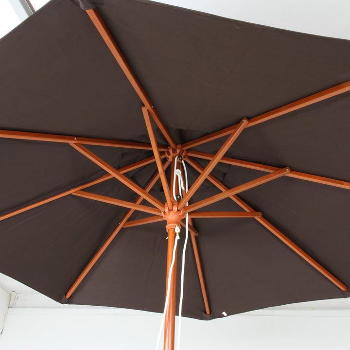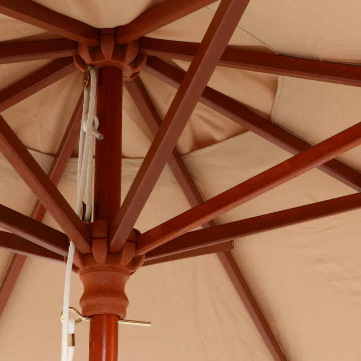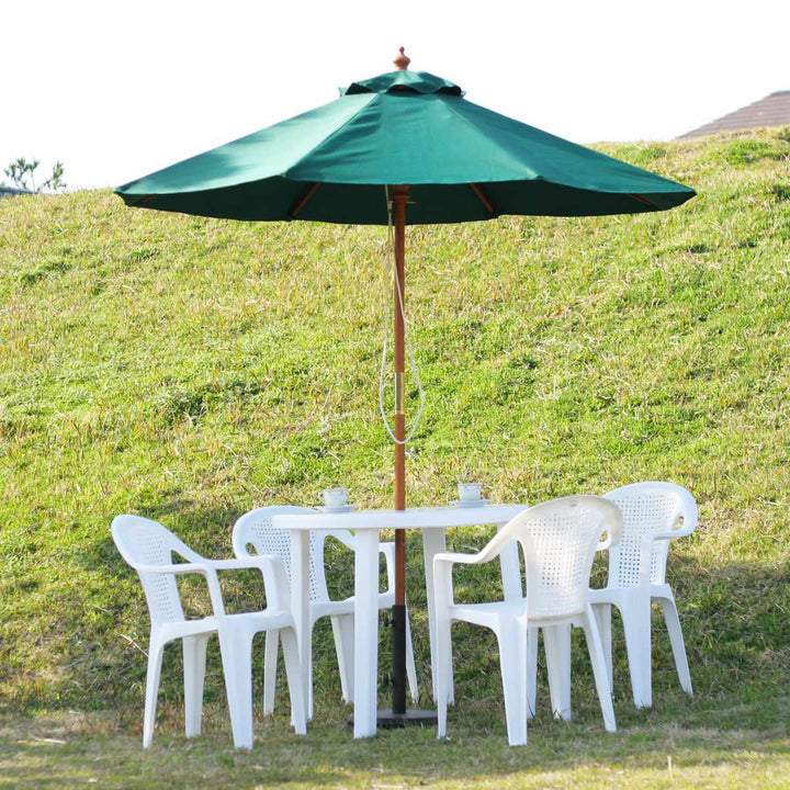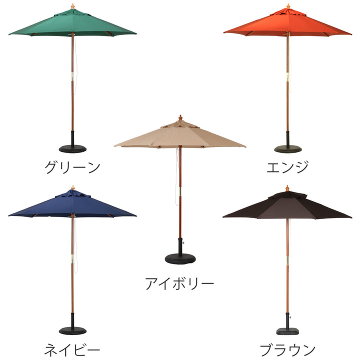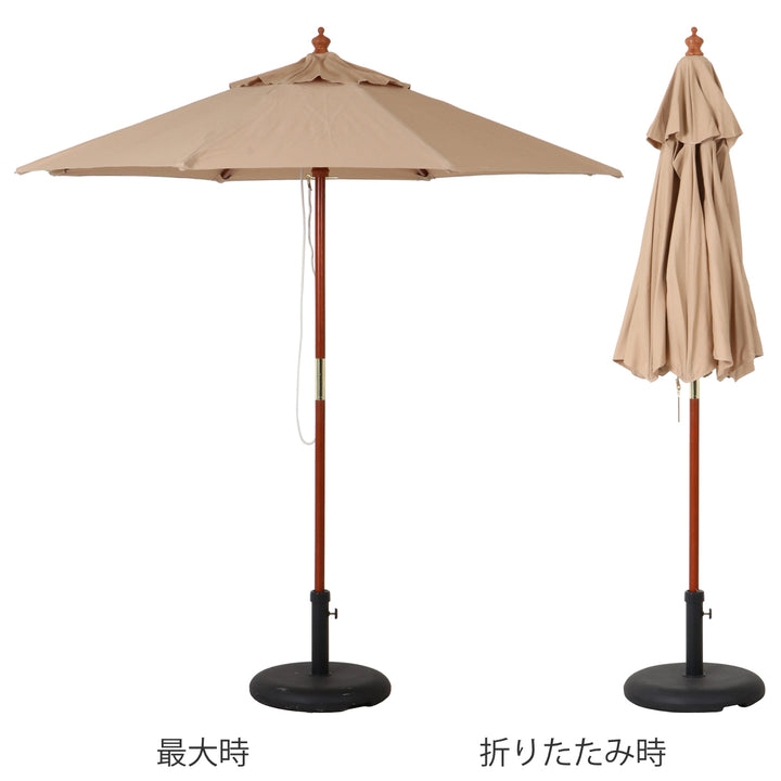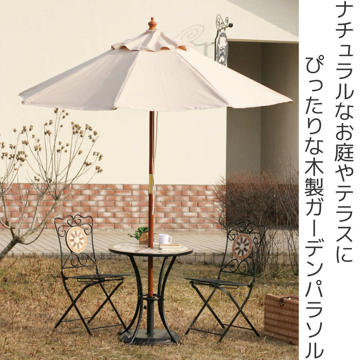 テーブルやベンチと合わせてお使いいただる木製のガーデンパラソル 210cmです。お庭で緑や花を見ながら一息つきたい時や、家族や友人たちとのバーベキューをする時などにも便利です。