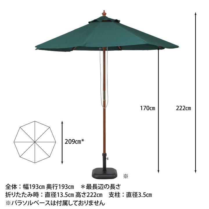| サイズ | 約 幅193×奥行193×高さ222(cm) 親骨の長さ:110cm 展開時最長辺サイズ:約210cm 支柱径:直径3.5cm |