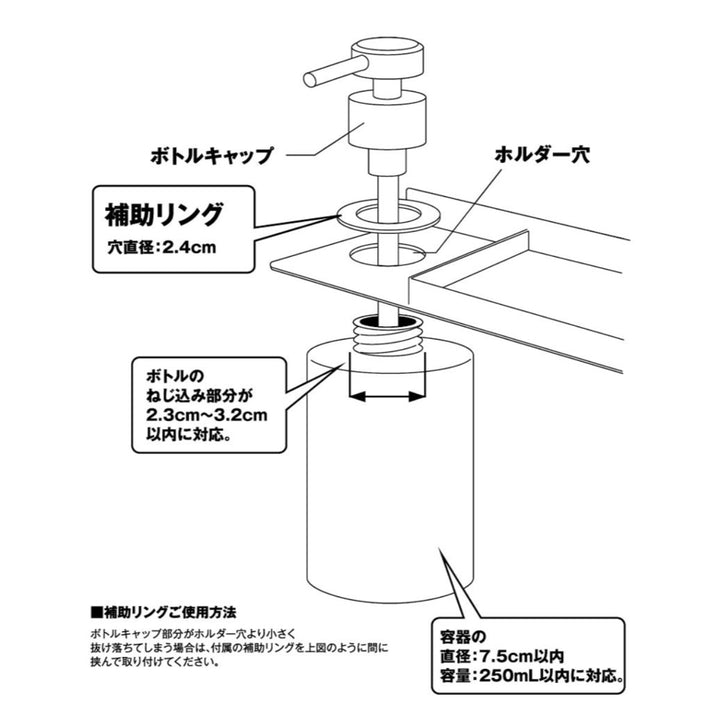 | 対応サイズ | ポンプ式ボトルのねじ込み部分:2.3cm~3.2cm以内 容器の直径:7.5cm以内・容量250mL以内を目安にしています |