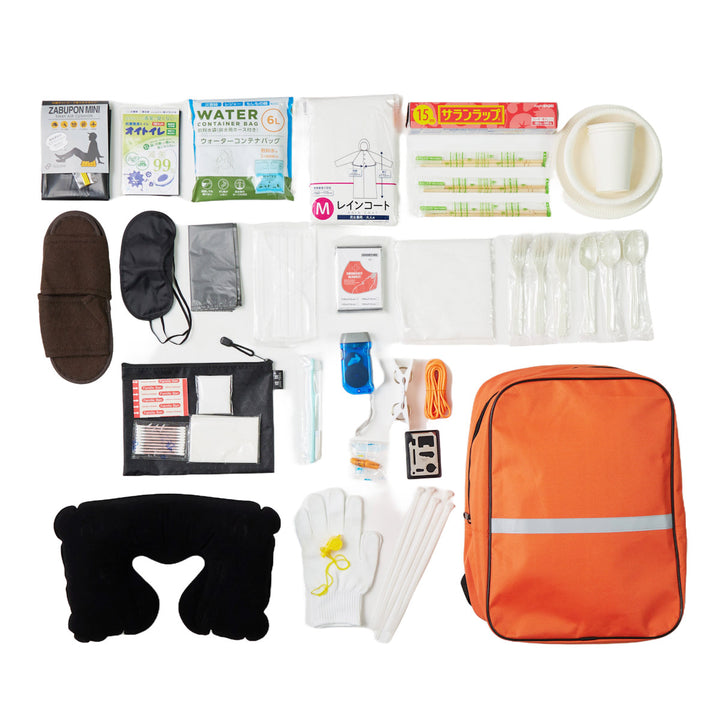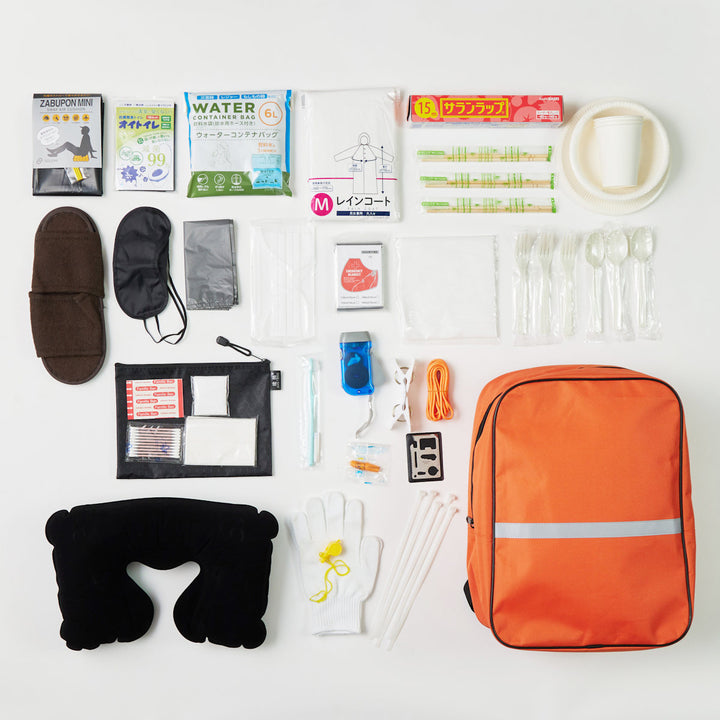 リュック・万能カッター・ホイッスル・アルミブランケット・手動式懐中電灯・軍手・ロープ(3m)・アイマスク・耳栓・ネックピロー・小物入れ・洗濯ばさみ・結束バンド・スリッパ・レインコート・ラップ(22cm×15m)・水に流せるティッシュ・ドライタオル・紙皿(18cm)・コップ270ml・紙ボウル15cm・割りばし(個包装)・スプーン・ポリ袋・フォーク・マスク・歯ブラシセット・絆創膏・綿棒・コットン・ザブポンミニ・ウォーターコンテナバック6L・オイトイレ1回分