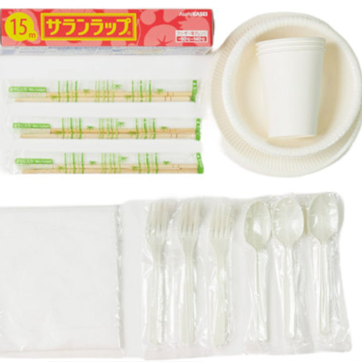 避難所などでの食事の際に使える割りばし、スプーン、フォーク、紙ボウル、紙皿、紙コップとラップも入っています。ラップは紙皿を使用する時に敷いておくと、紙皿を繰り返し使えます。断水時など、すぐに水が使えない状況でも使用できるので、とても便利です。