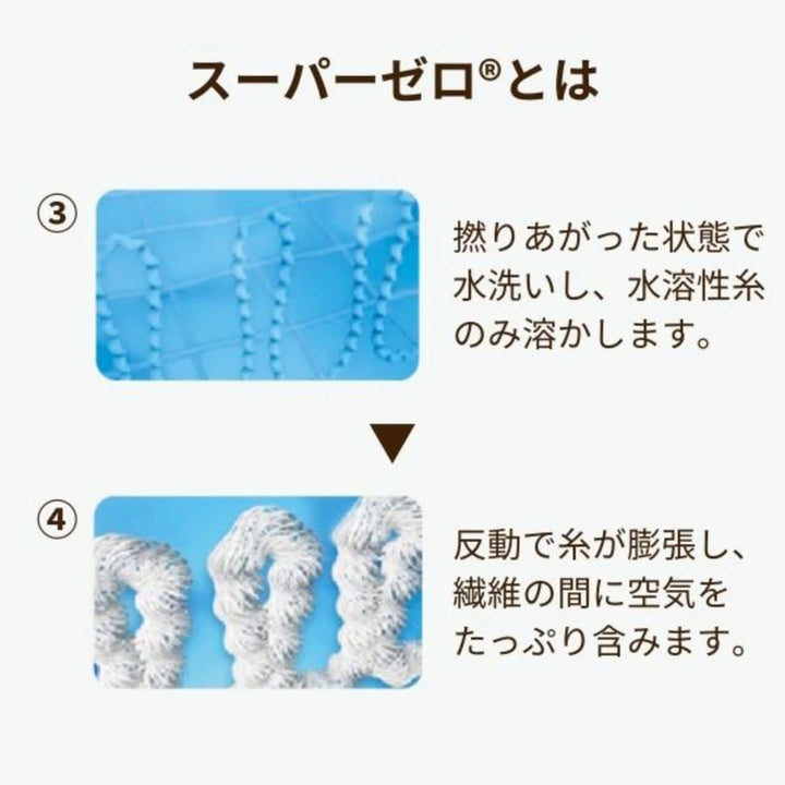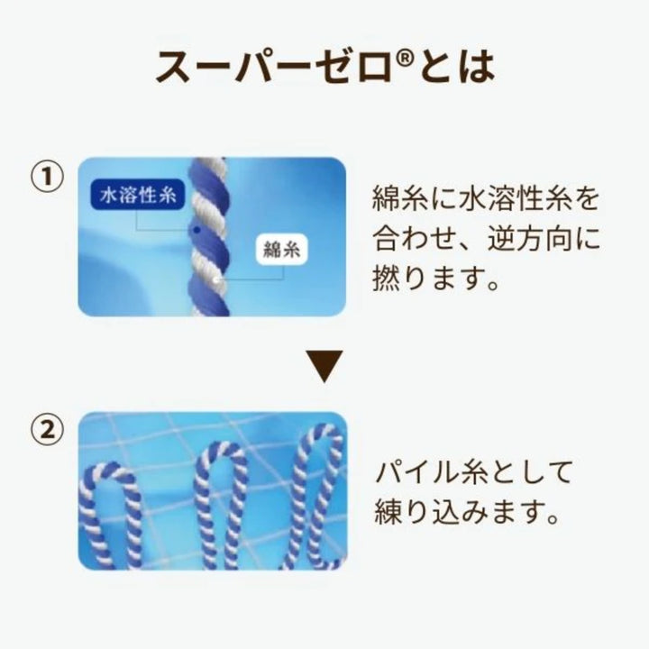特殊撚糸「スーパーゼロ」は、繊維の間にたっぷりと空気を含むので、ふっくらとしたやわらかな肌ざわりが特徴です。また抜群の吸水力で、耐久性や通気性にも優れています。