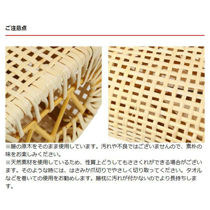 ※天然素材を使用しているため、性質上どうしてもささくれができる場合がございます。そのような時には、はさみか爪切りでやさしく切り取ってください。タオルなどを巻いての使用をお勧めします。籐枕に汚れが付かないのでより長持ちします。