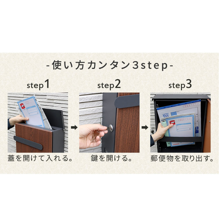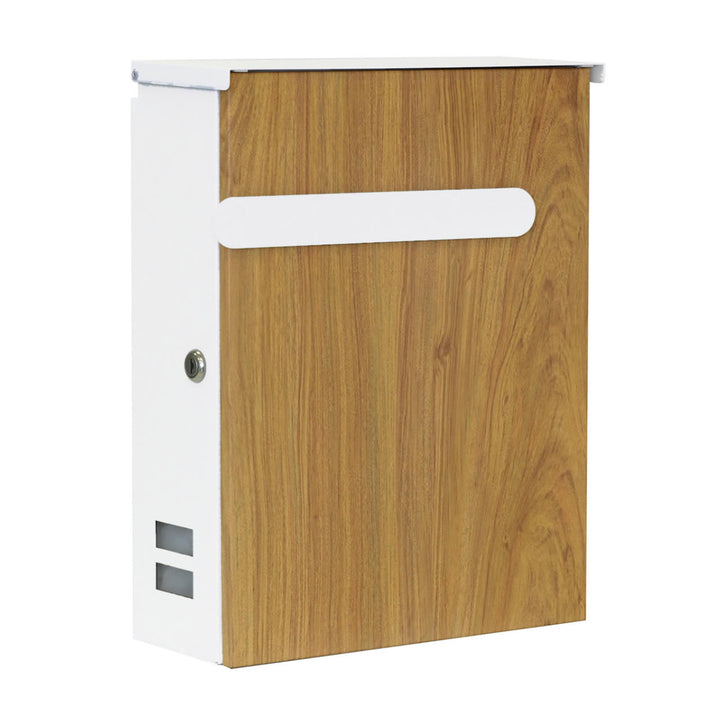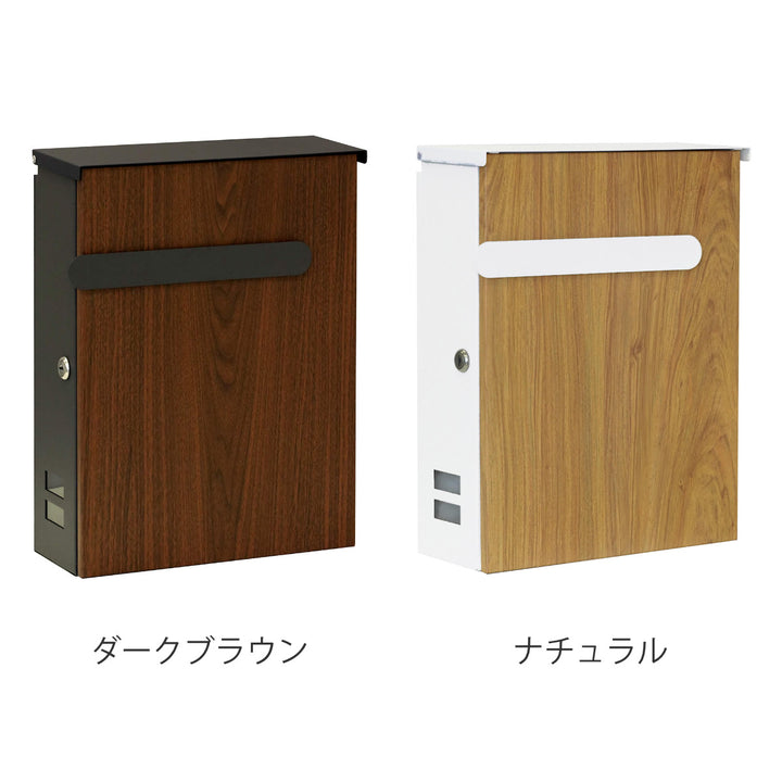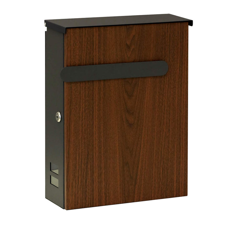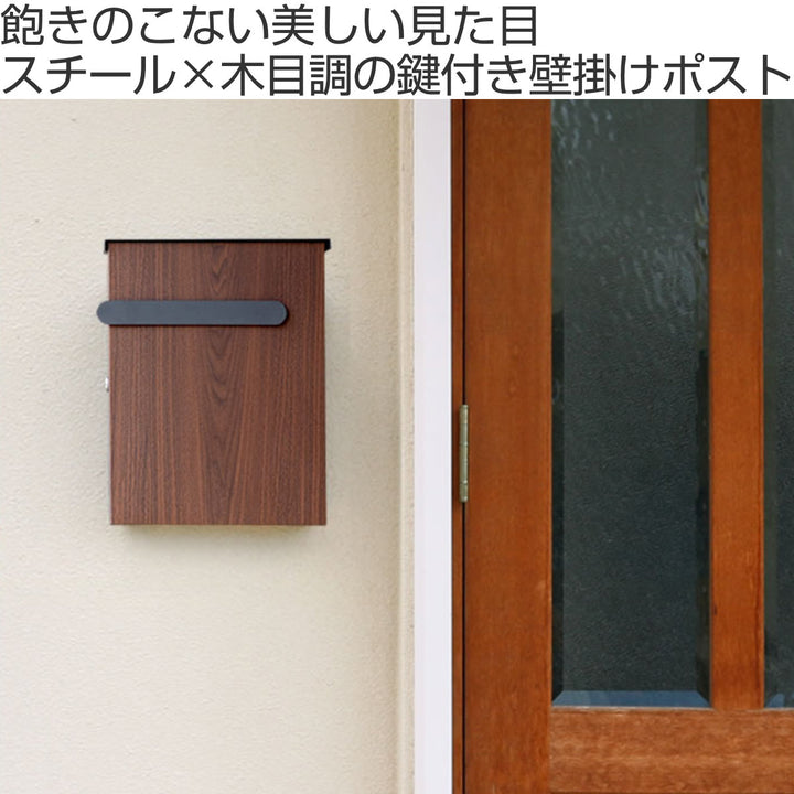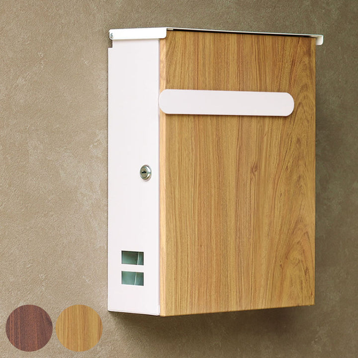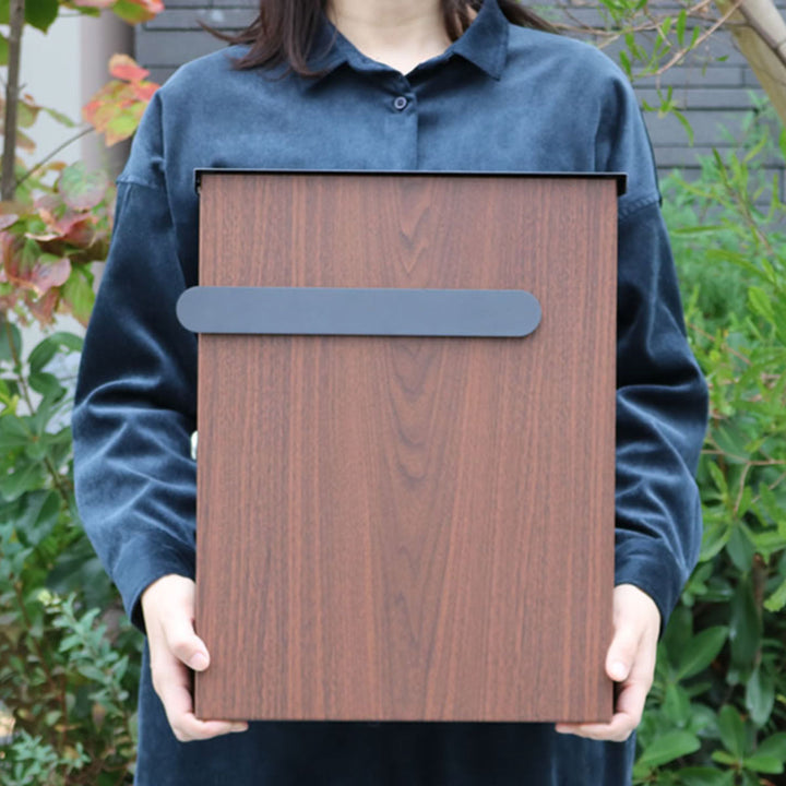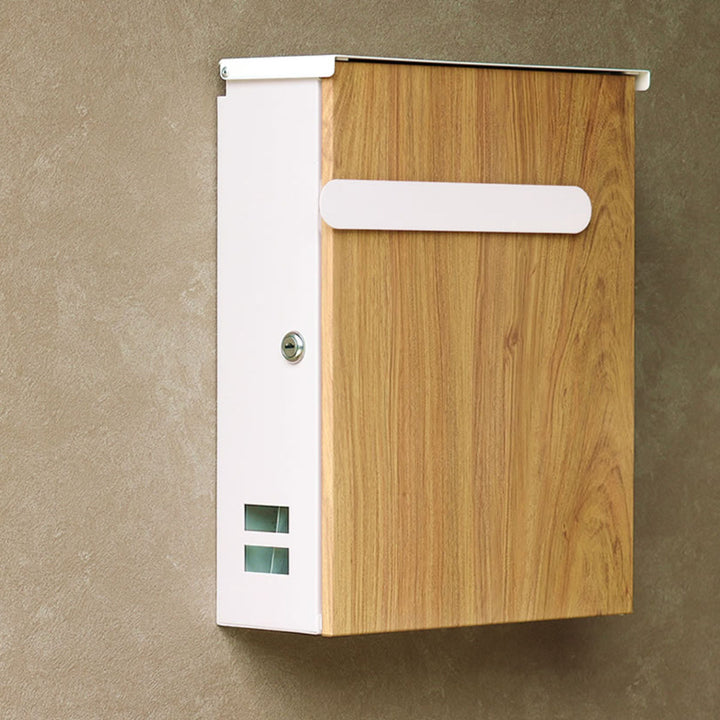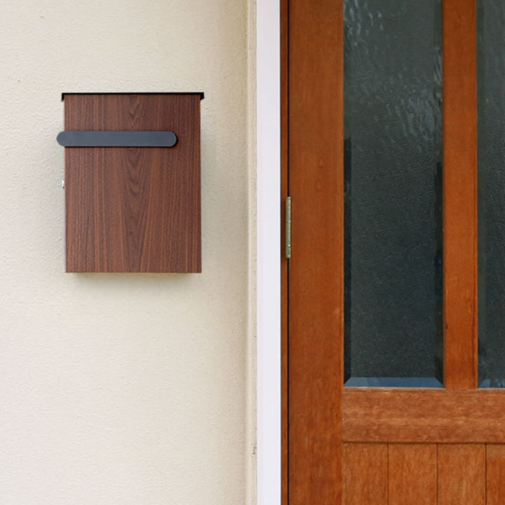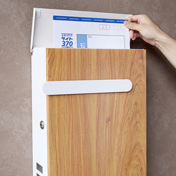 エントランスにモダンな彩りを与える木目調デザインの壁掛けポストです。スッキリとした印象を与えるシンプルなスクエア型で、投函口が蓋で隠れているため雨や埃の侵入を防ぎます。