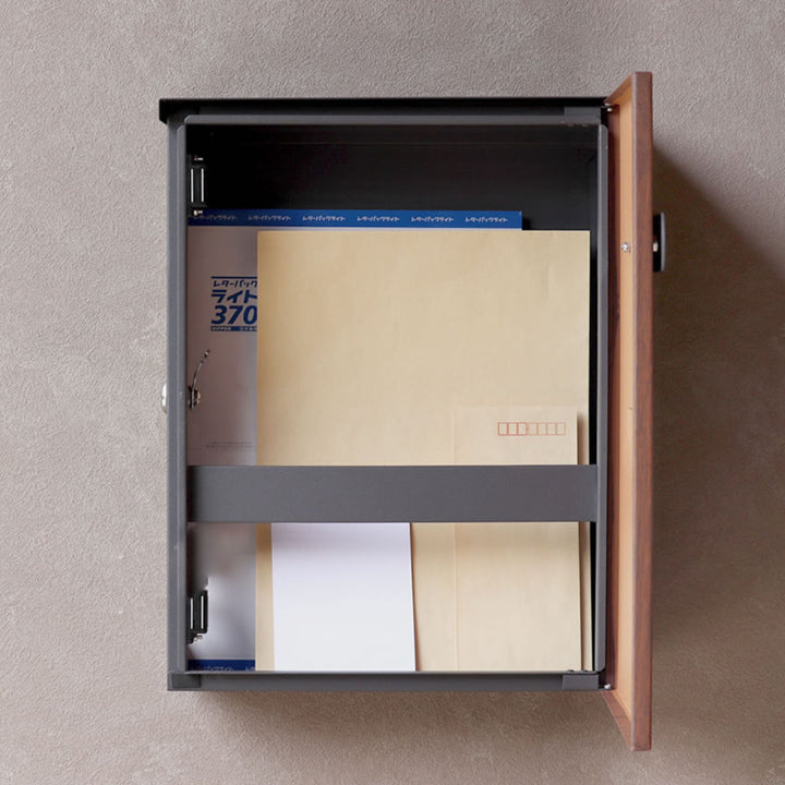 前扉は大きく開くので大きめの郵便物もスムーズに取り出すことができます。内側にはストッパーが付いているので、郵便物が前に倒れるのを防いでくれます。
