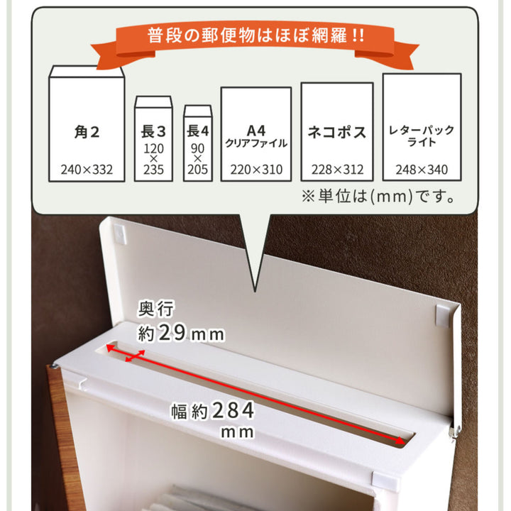 投函口は幅約28.4cm×奥行約2.9cmなので、茶封筒角型2号やメール便なども投函可能です。