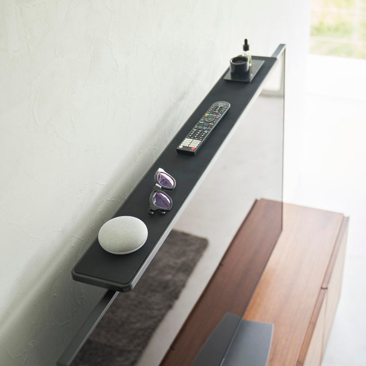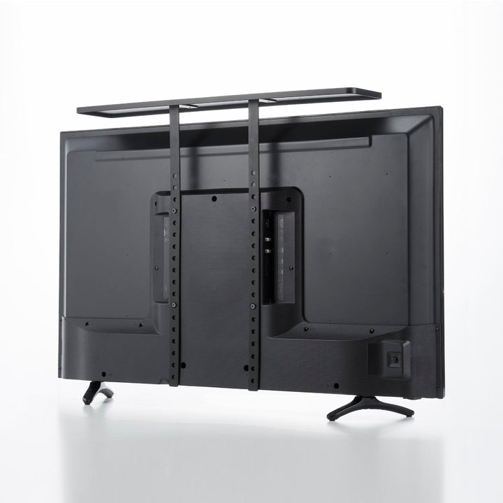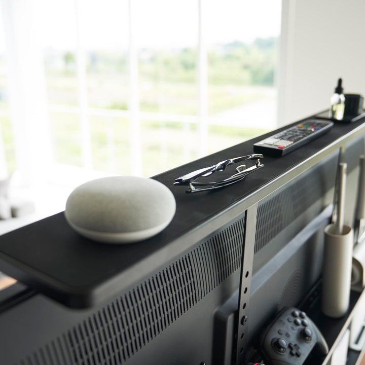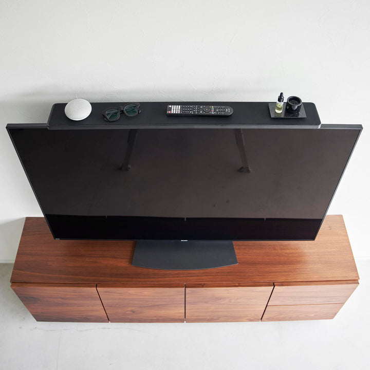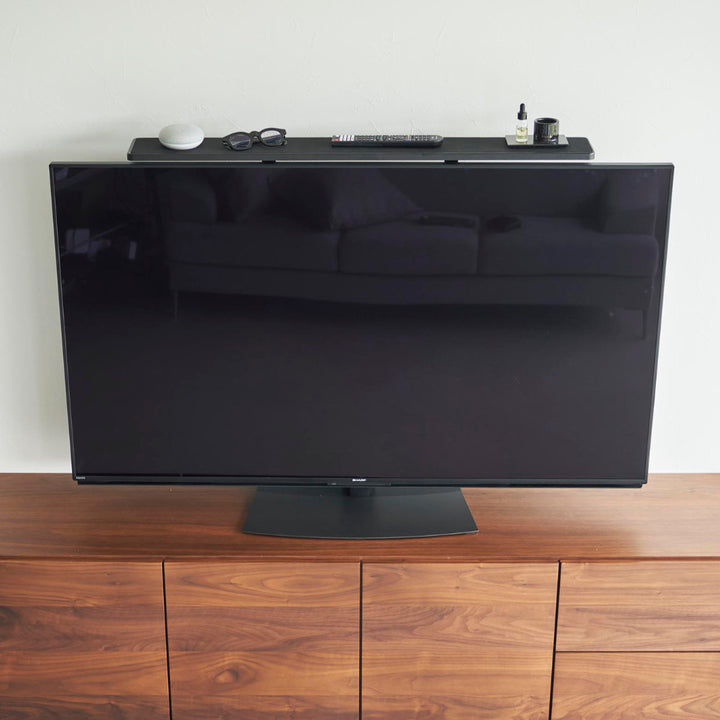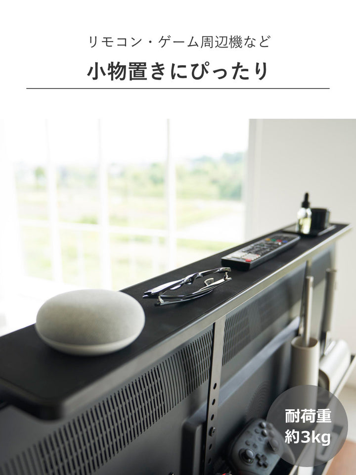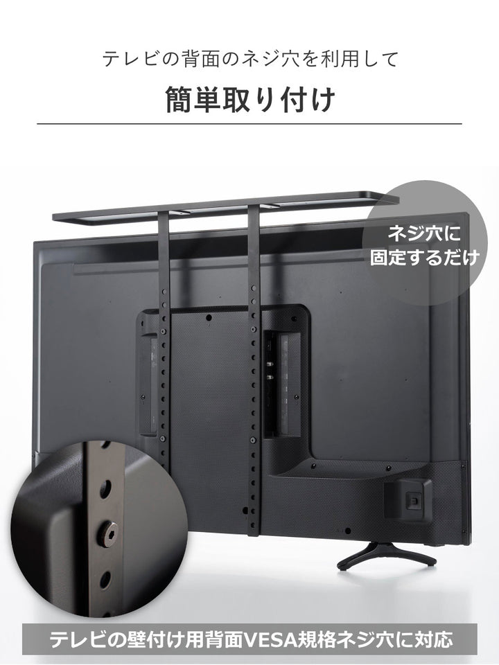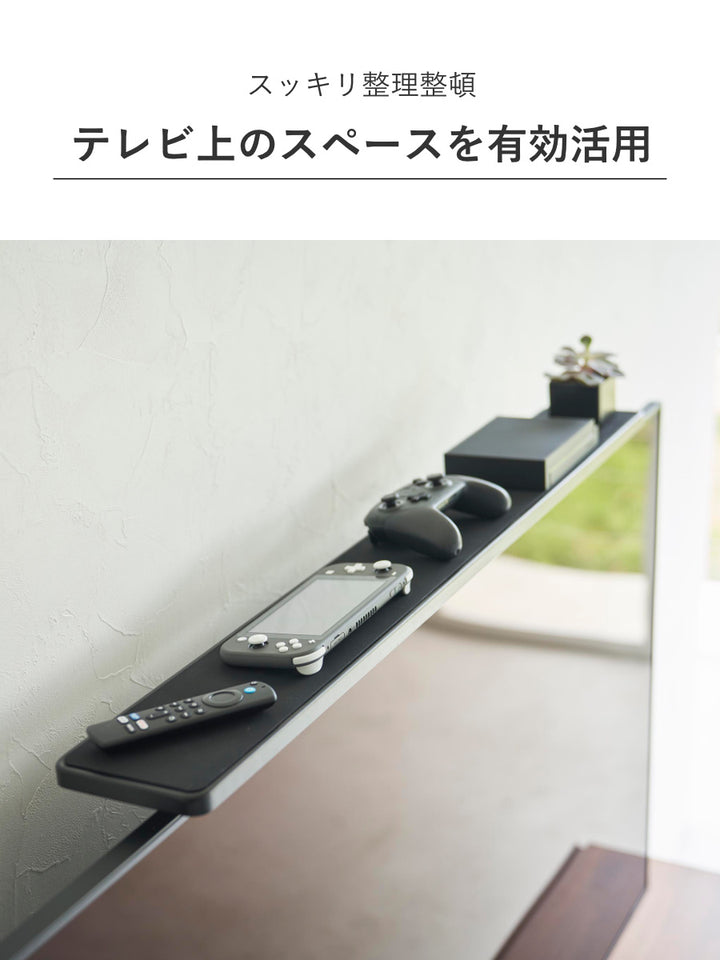 テレビ周りの小物類を置くのに便利なテレビ上ラックです。テレビの背面のネジ穴を利用して固定するだけで取り付けることができ、テレビ上のスペースを有効活用できます。