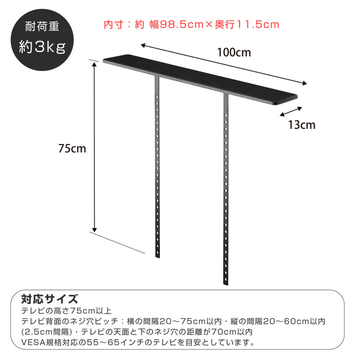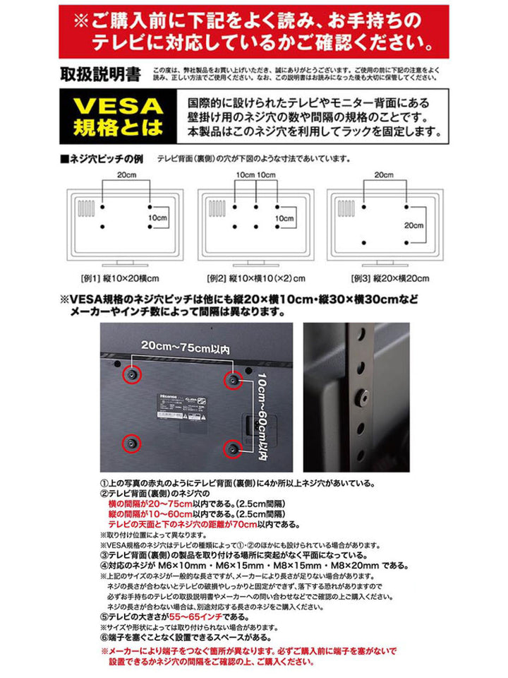| 対応サイズ | テレビの高さ75cm以上 テレビ背面のネジ穴ピッチ:横の間隔20~75cm以内 縦の間隔20~60cm以内(2.5cm間隔) テレビの天面と下のネジ穴の距離が70cm以内 VESA規格対応の55~65インチのテレビを目安としています。 |