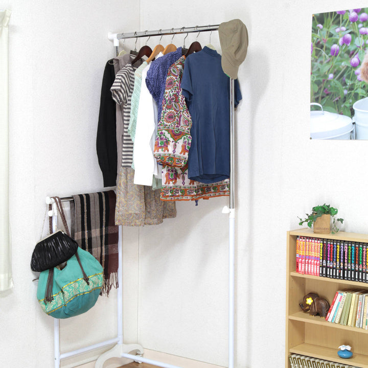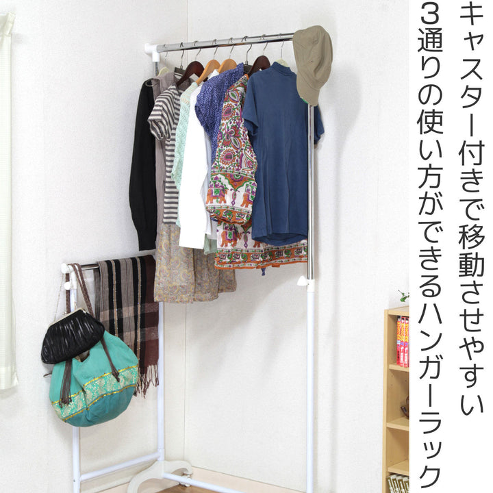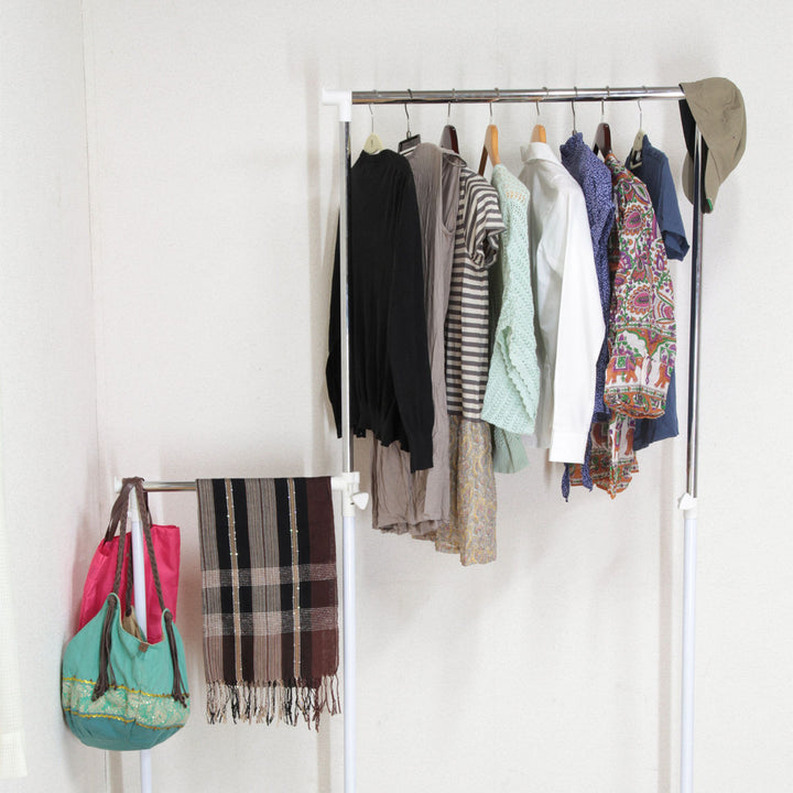 横一列型、L字型、収納型の3通りの使用方法があるハンガーラックです。収納物やお部屋の大きさなどに合わせてお使いいただけます。高いバーと低いバーが一緒になっているので、シングルハンガーに比べて2倍の収納力があります。