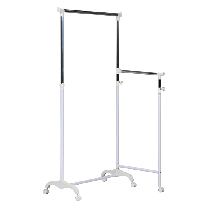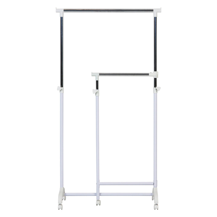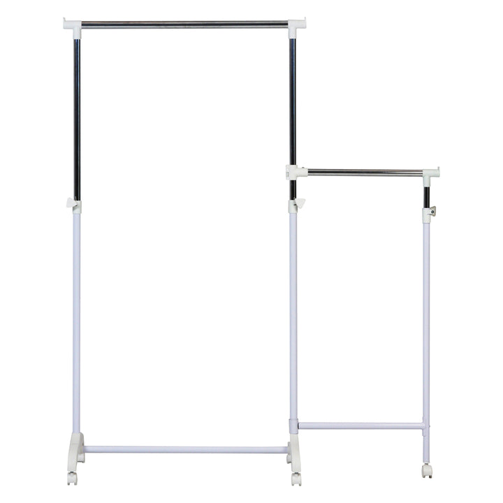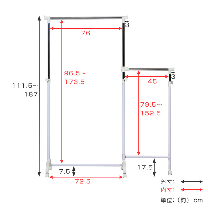 ハンガーラックは高さ調節が可能です。本体のバーは高さ約96.5~173.5cmまで、低いバーは高さ約79.5~152.5cmまで無段階で高さを変えることができます。一番高く上げれば丈の長いワンピースやロングコートなどが掛けられ、低く下げればお子様の洋服などを掛けるのに最適の高さになります。掛ける物や用途に合わせて、使いやすい高さに調節してお使いいただけます。