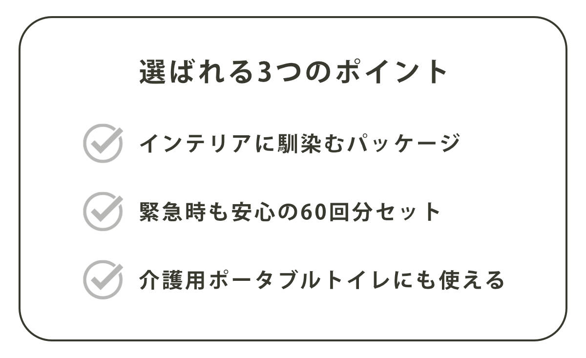 災害時だけでなく、介護用ポータブルトイレにもお使いいただけます。使用後の後片付けが簡単になり、菌や臭いの心配も軽減されるので、室内環境を快適に保つことができます。