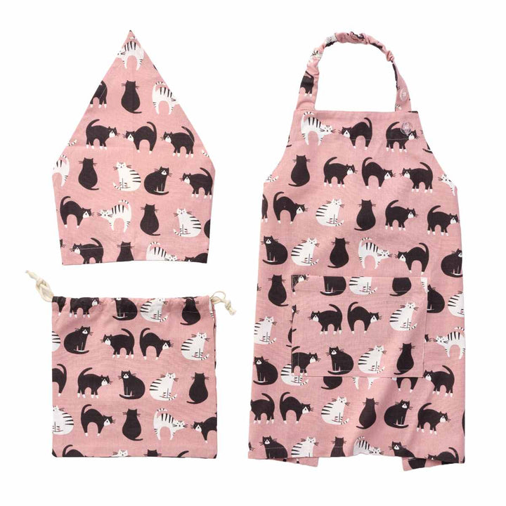 幼稚園~小学校中学年(身長100~130cm)のお子様向けのエプロン・バンダナ・巾着の3点セットです。可愛らしいネコの総柄デザインです。良質なインド綿でしっかりと織られた生地なので丈夫です。持ち運びに便利な巾着付きで家庭科の授業にもおすすめです。