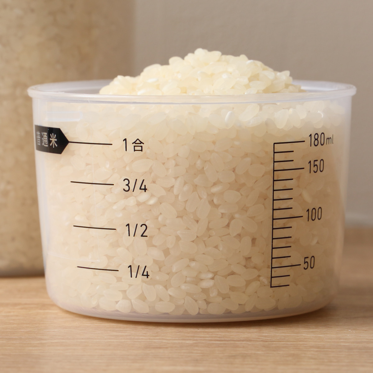 フタは目盛りがついているので、冷蔵庫から取り出してフタを開ければすぐに計量できます。また、普通米だけでなく無洗米も計量が可能です。