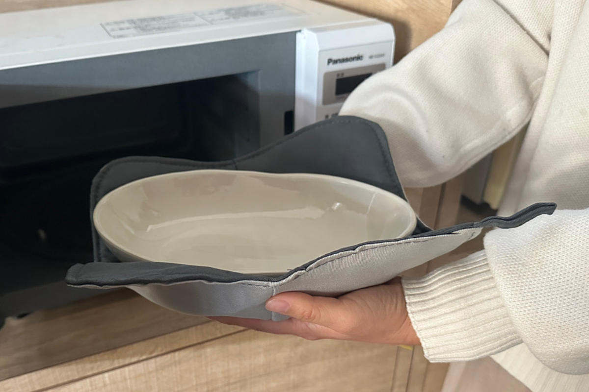 電子レンジで温めても熱くならない厚みのある素材でできたマットです。お皿と一緒にあたためることができ、熱々のお皿を安全に取り出すことができます。
