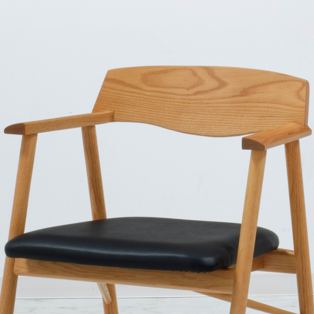 ゆったり座れるよう座面は広めの設計です。肘掛は外側に向かって流れるような曲線を描いており、心地よく腕を預けてくつろぐことができます。