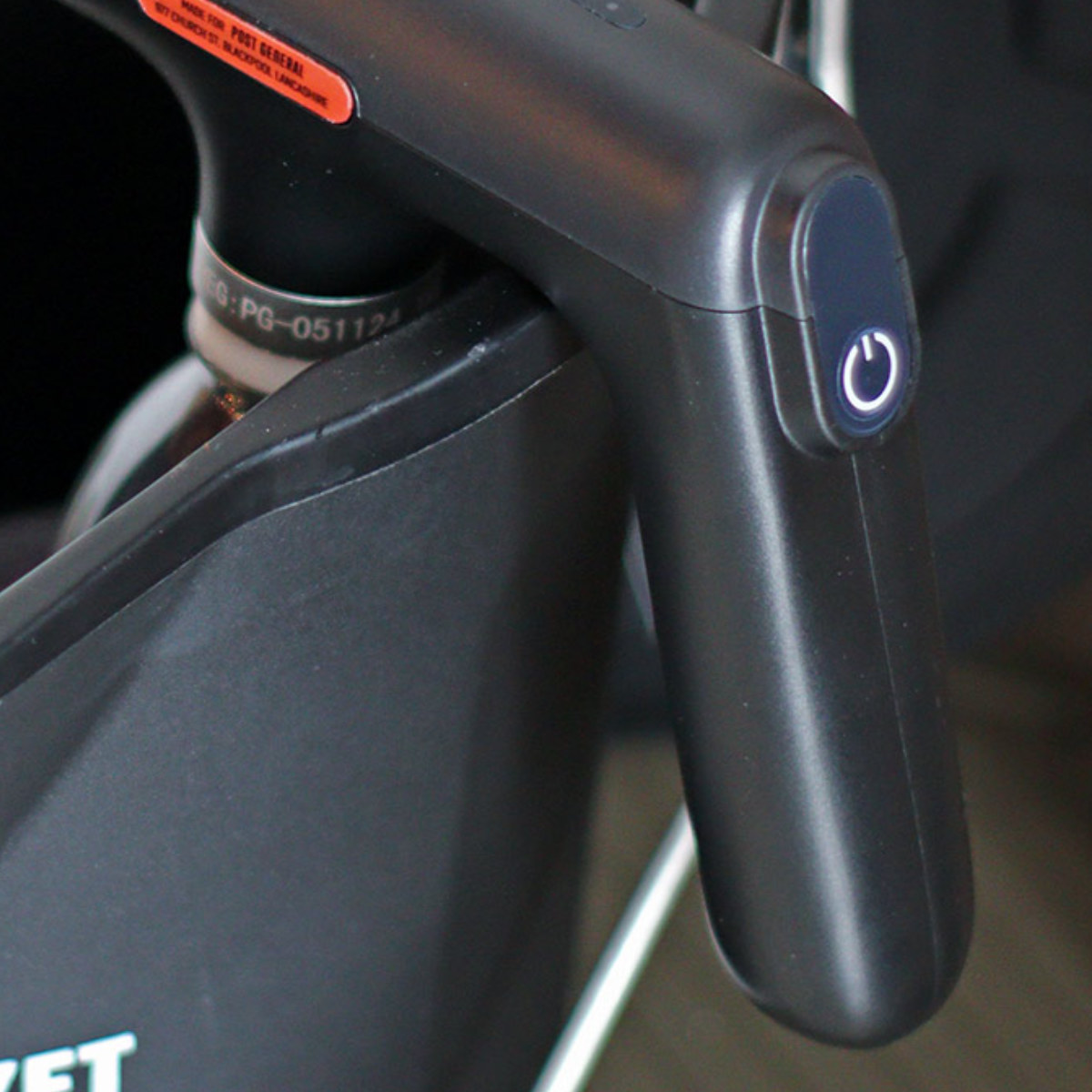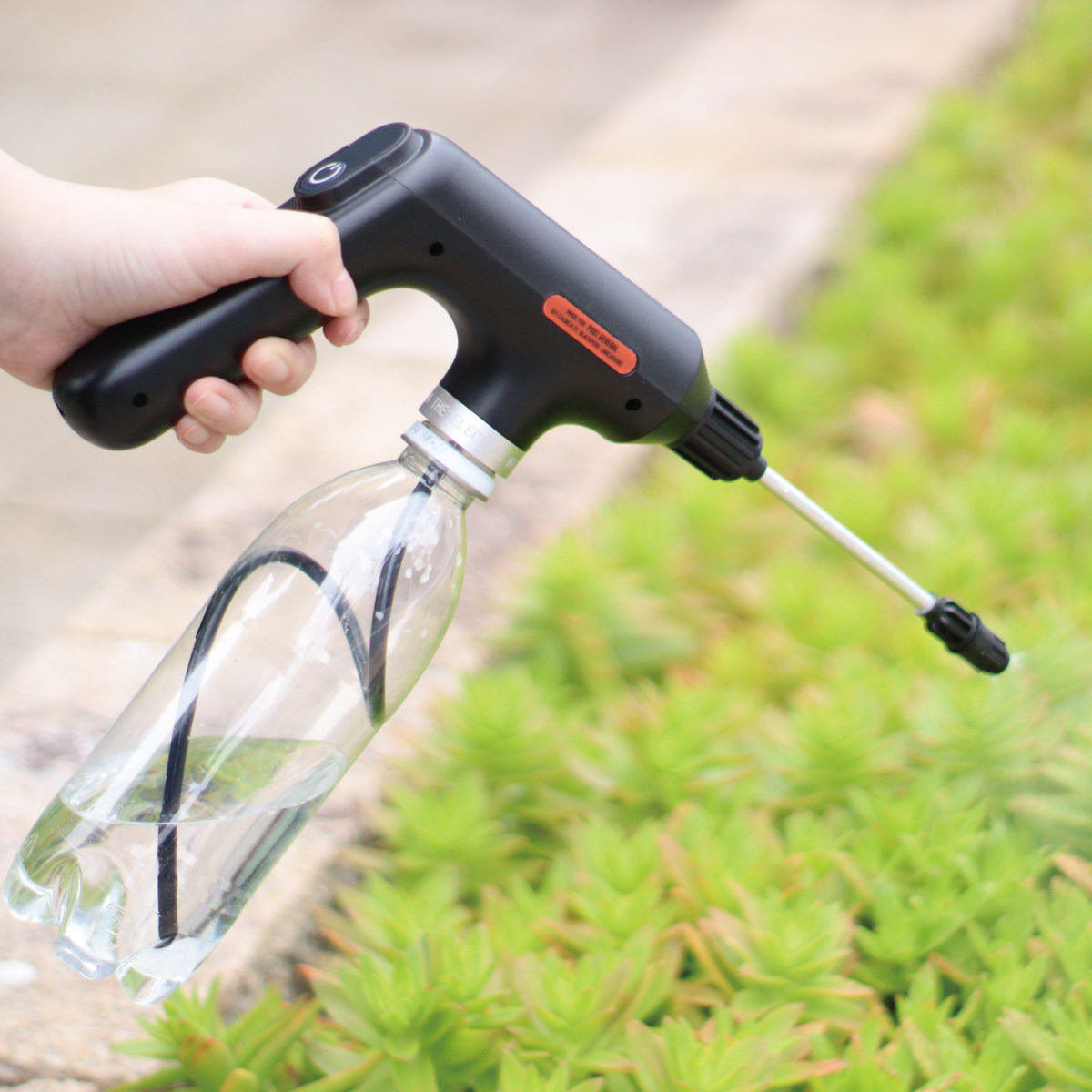 本体に市販のペットボトルをセットをするだけで電動で霧吹きができます。本体持ち手の電源ボタンを長押しすると電源が入り、電源が入ると同時に自動噴射がスタートします。(連続で約2時間の噴射が可能)ボタンから指を離しても自動で霧吹きが出続けるので、指が疲れることもありません。もう一度電源ボタンを押すとOFFになります。