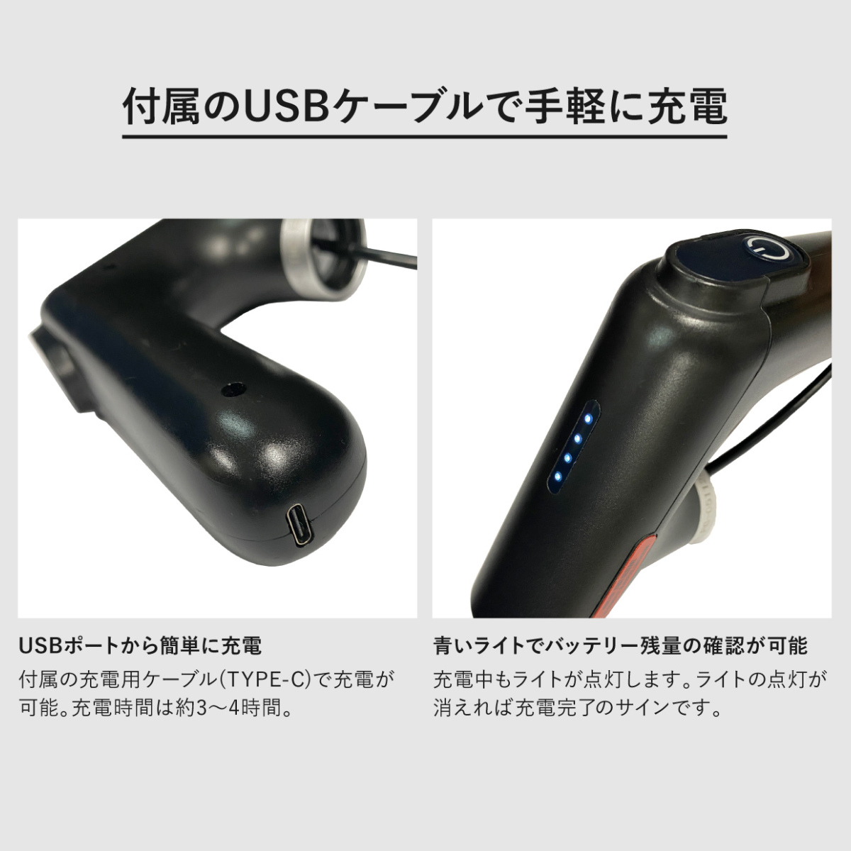 充電時間は約3~4時間、フル充電で約2時間の連続使用が可能です。USBポートから充電可能なので、面倒な電池交換も不要です。