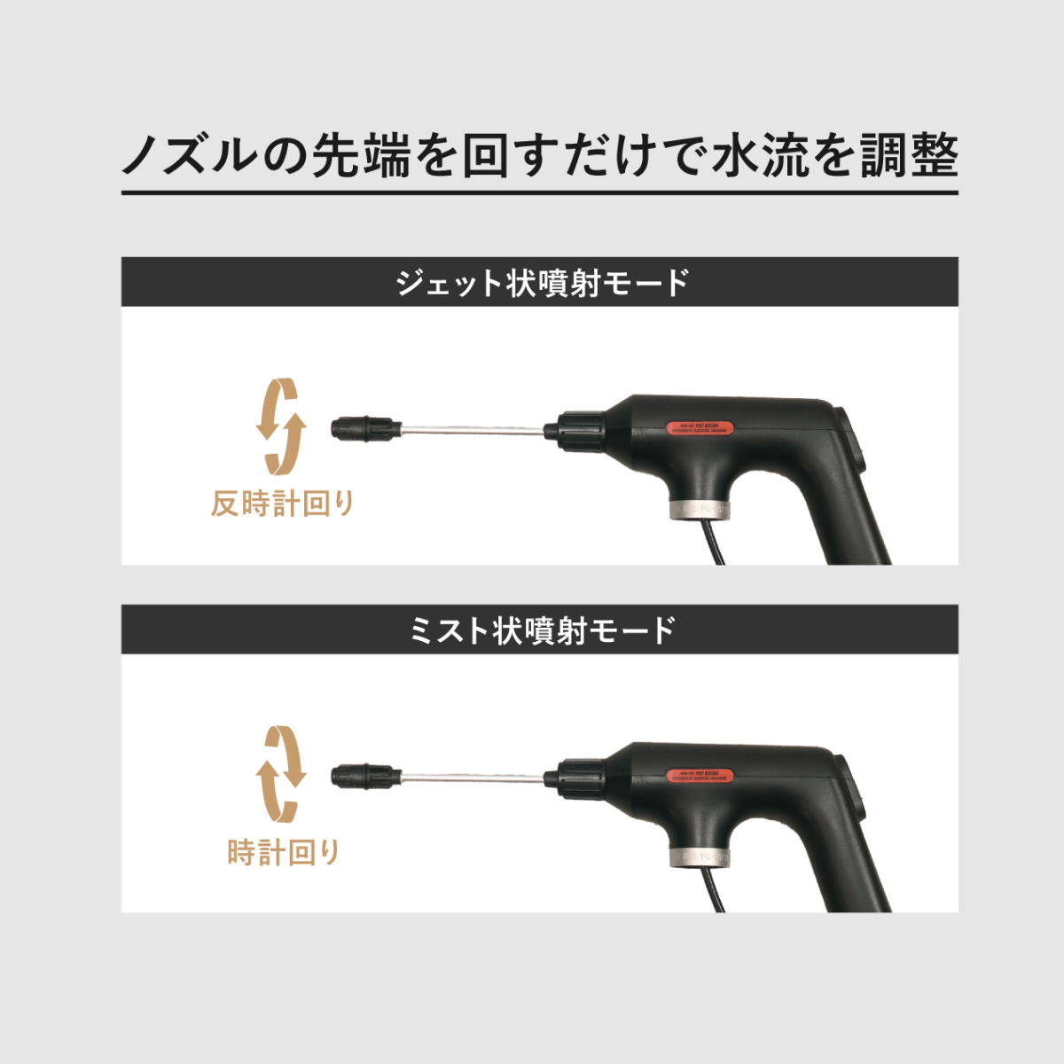 ノズルの先端を回すだけの簡単な操作で、ジェット状噴射・ミスト状の噴霧の水流調整が可能です。