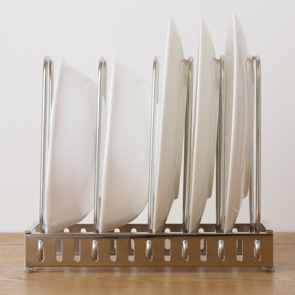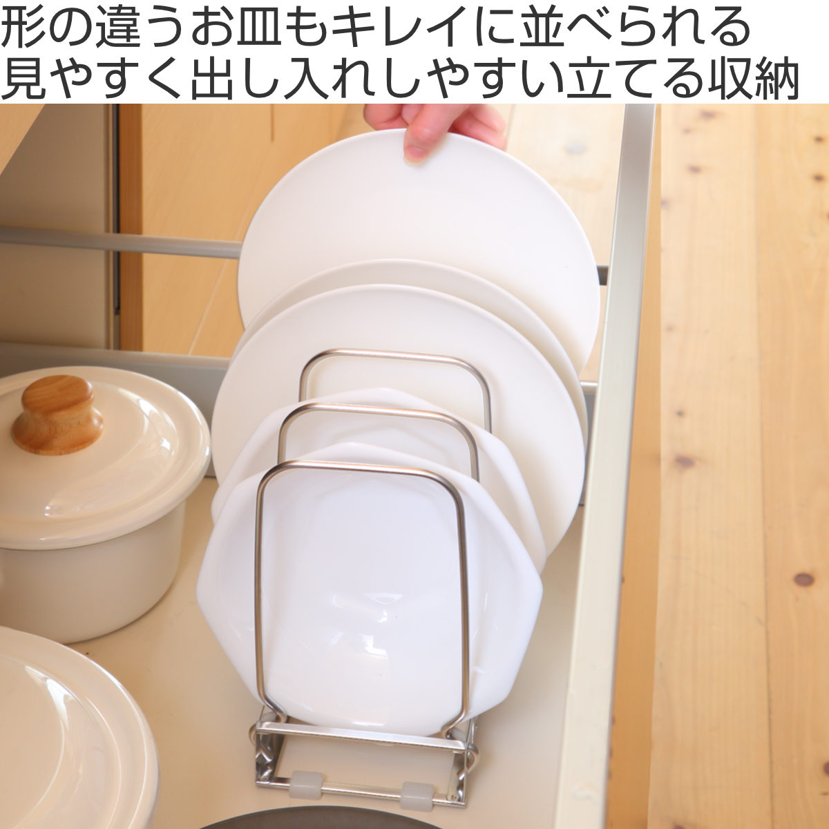 お皿を立てて収納できるスタンドです。並べて収納することで使いたい時に迷わず片手でサッと取り出せます。シンク下の引出しや扉内、食器棚内でもお使いいただけます。