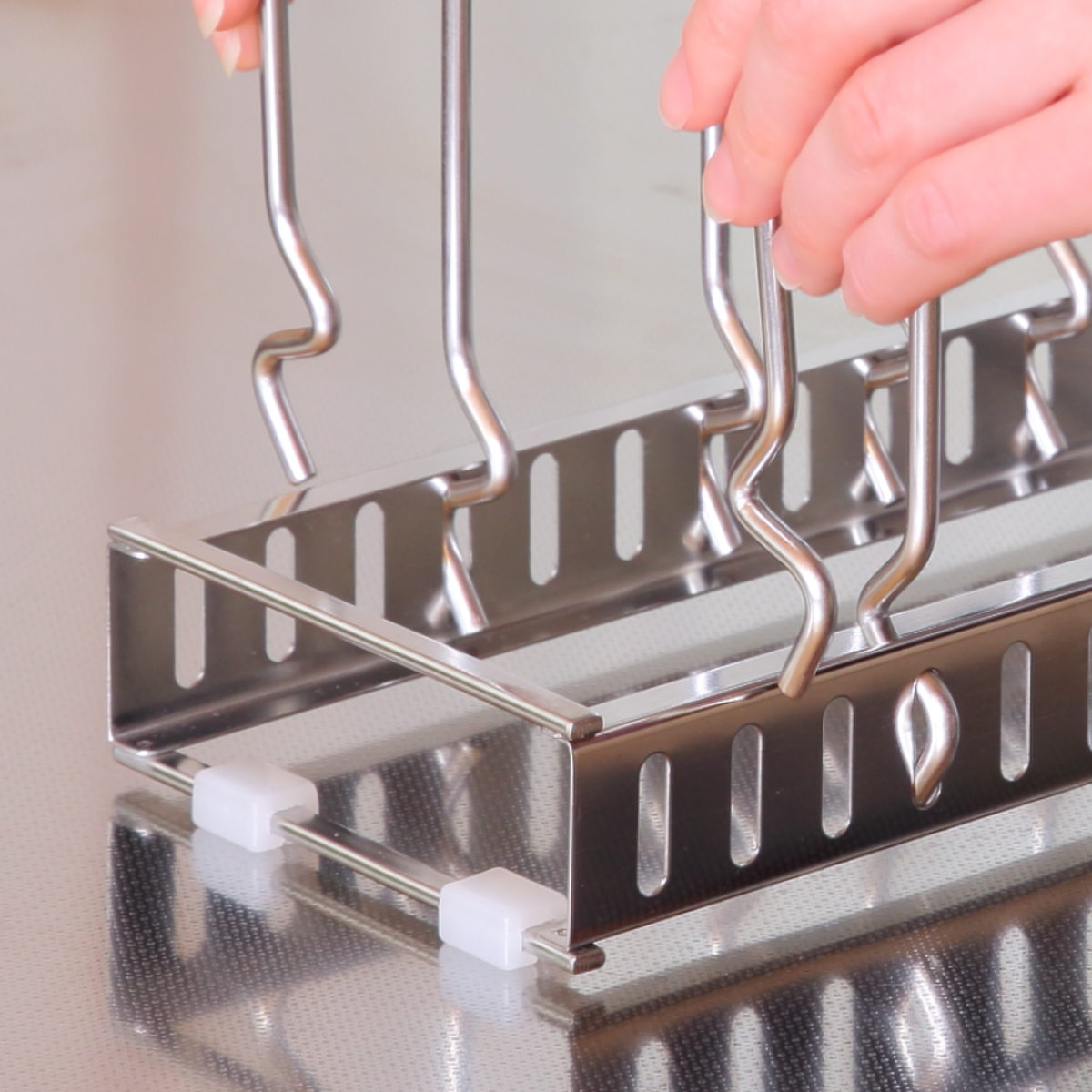 お皿や器に合わせて、幅調節が可能です。重ねて収納するよりも見やすく、取り出しやすいです。