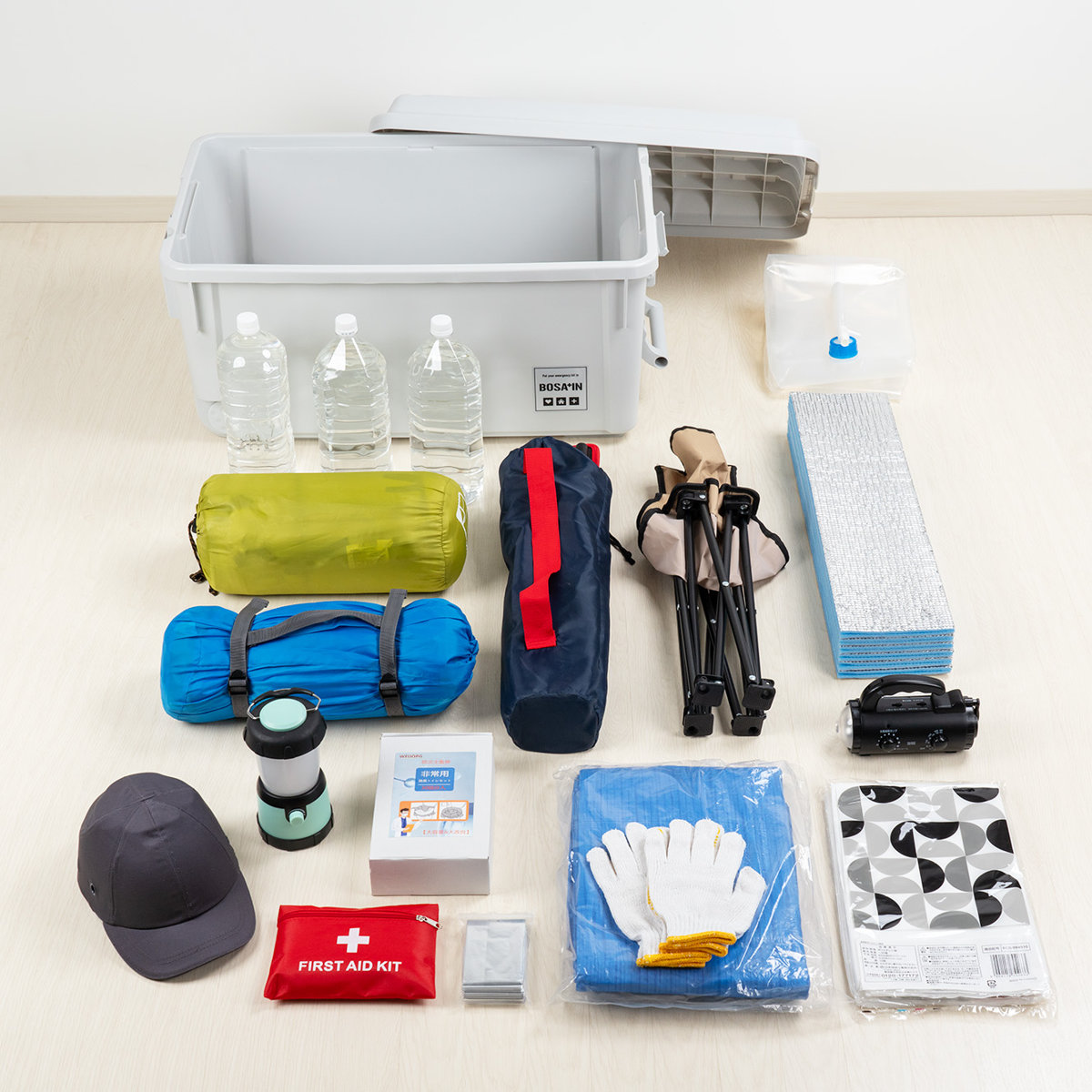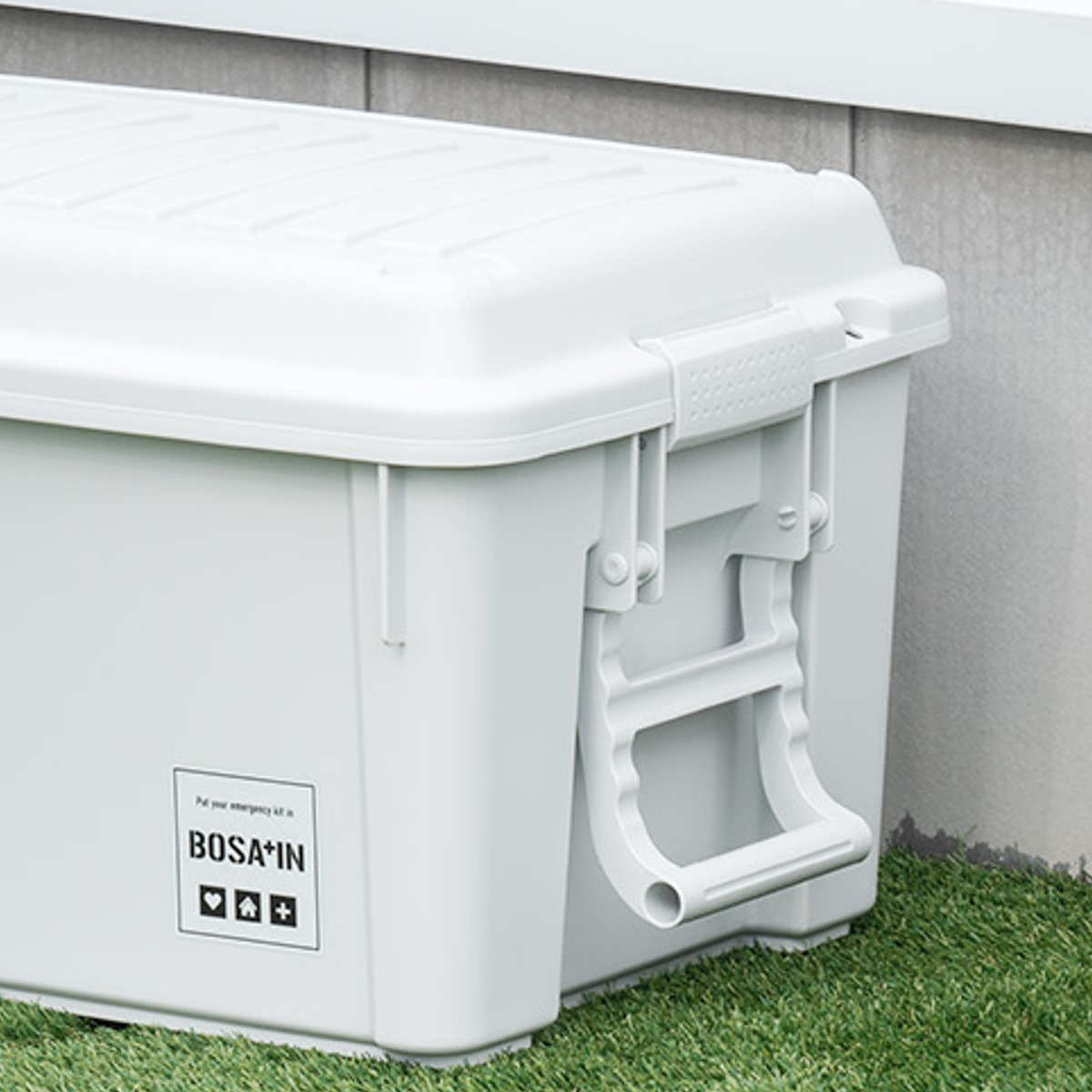 防災のための備蓄品を大容量収納できる収納ボックスです。暗闇で光を反射するステッカー付きで停電時でも見つけやすく安心です。高温になるベランダには紙の食器やポリ袋・ラップ・ホイル・手袋・簡易トイレなどを保管、また断水に備え飲用に使わない生活用水の備蓄にもおすすめです。