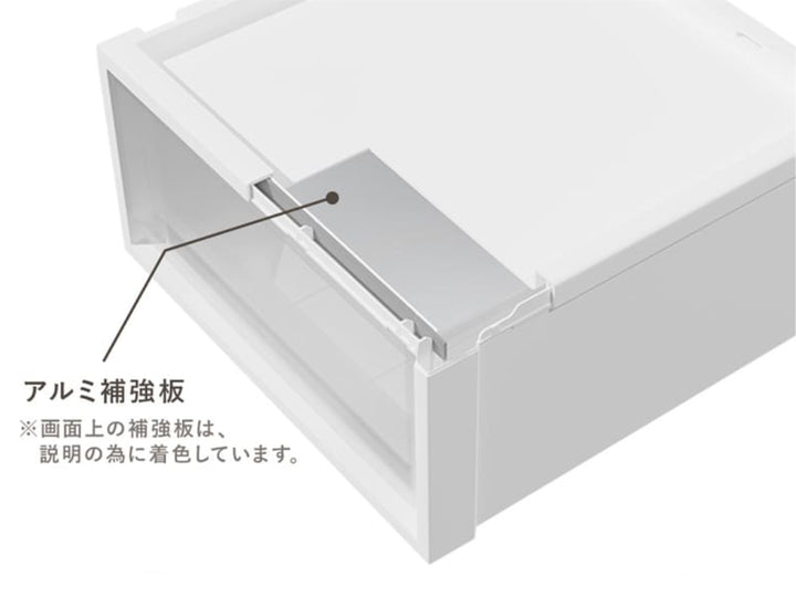 天板のたわみを防ぐために、アルミ補強板を内蔵しています。 積み重ねても下段が変形しにくく、引き出しやすいです。