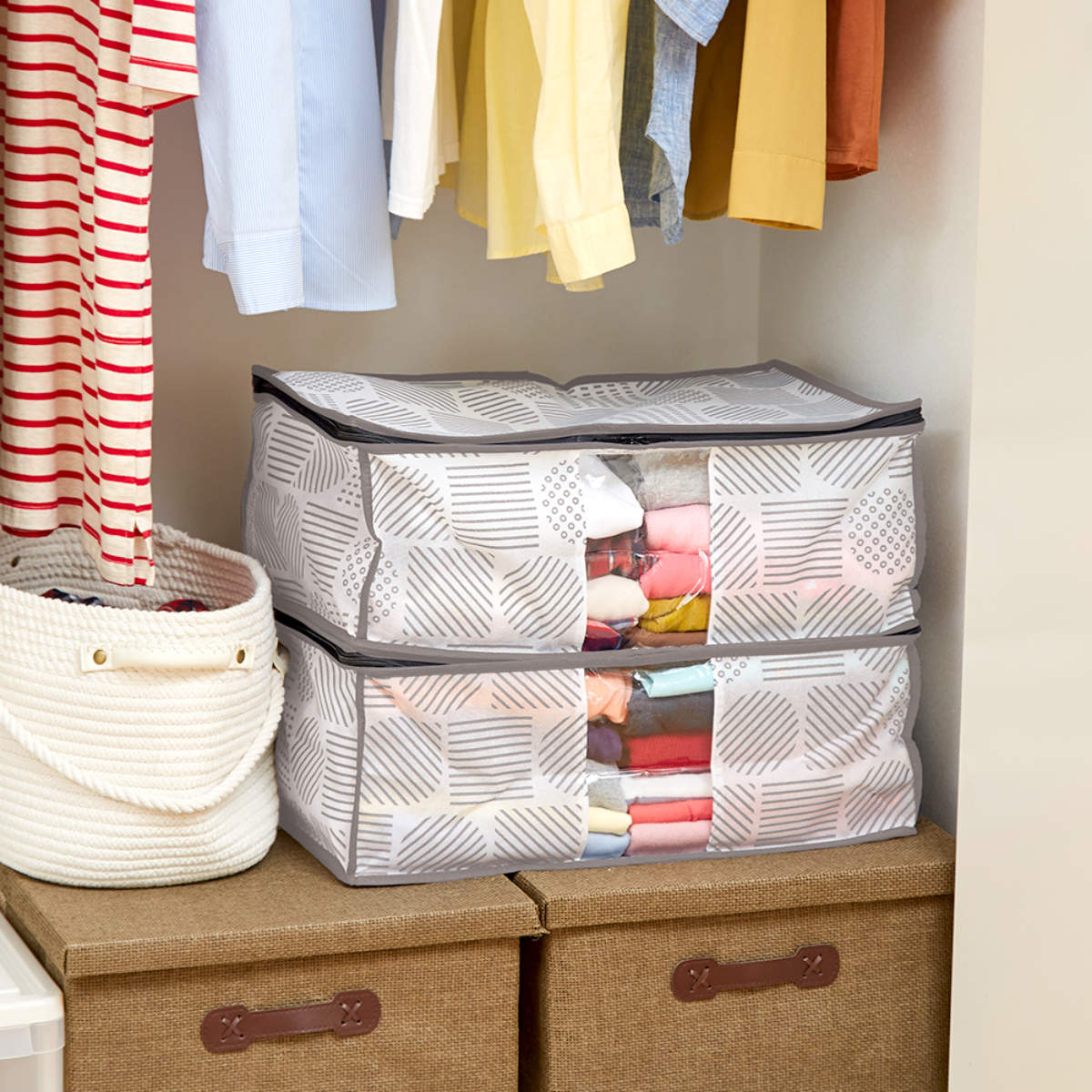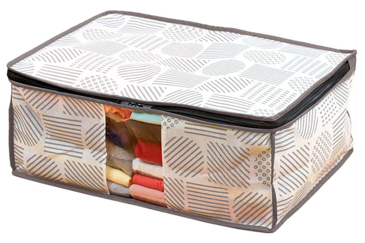 白地に落ち着いたグレーカラーのおしゃれな模様はインテリアにも馴染み、生活感もしっかりカバーします。クローゼットにはもちろん、お部屋に出しておいても悪目立ちしません。