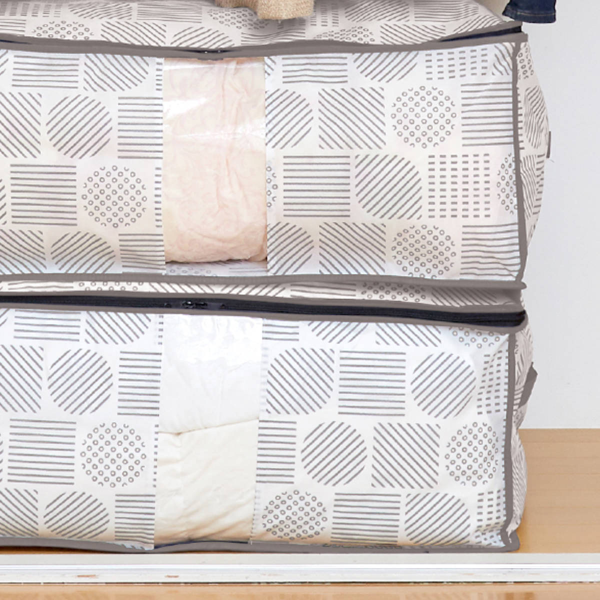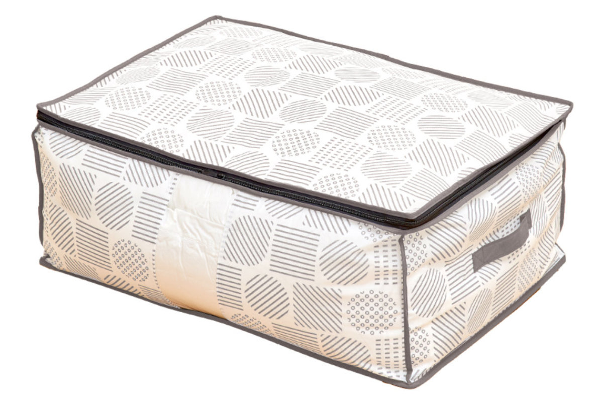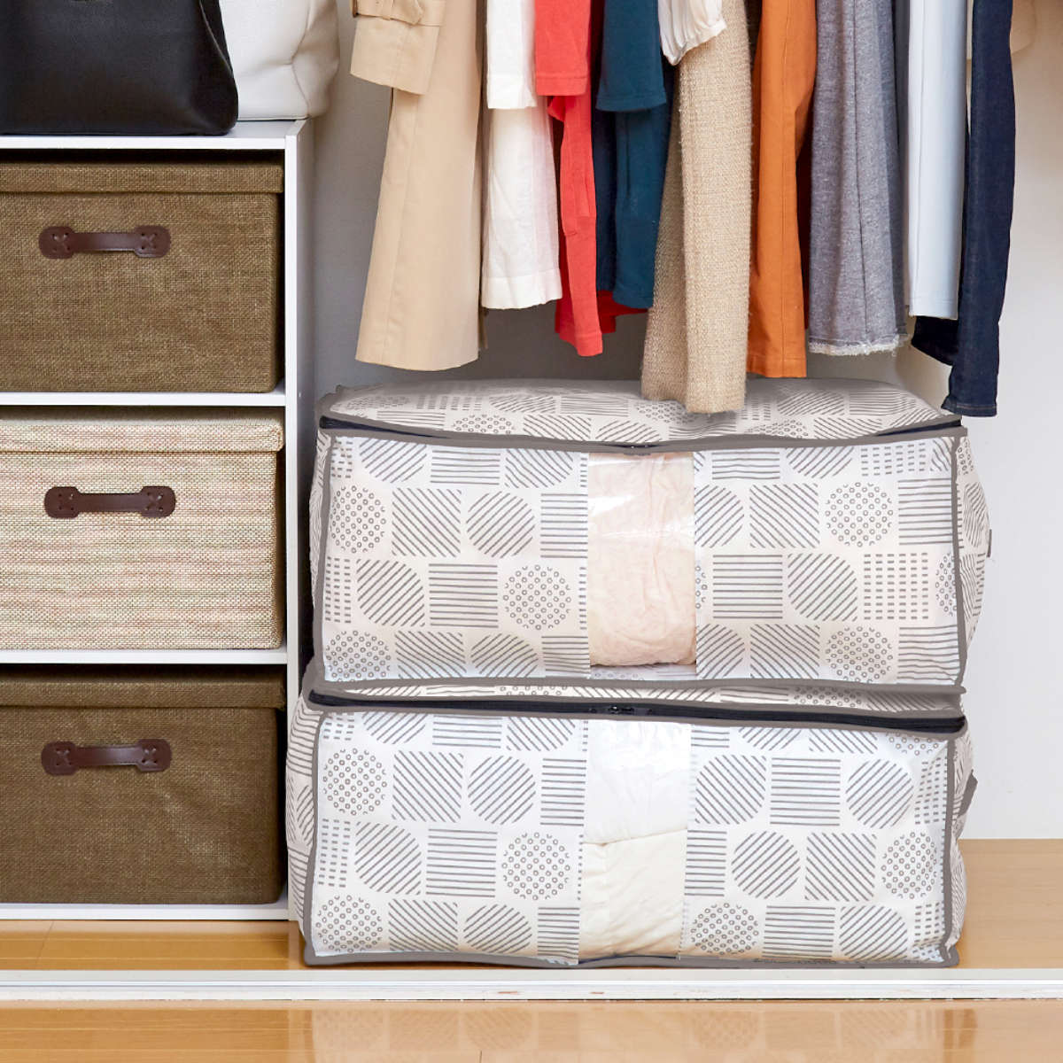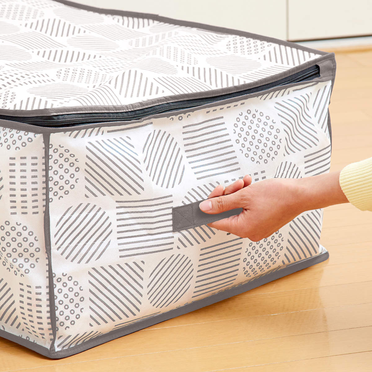 白地に落ち着いたグレーカラーのおしゃれな模様はインテリアにも馴染み、生活感もしっかりカバーします。クローゼットにはもちろん、お部屋に出しておいても悪目立ちしません。