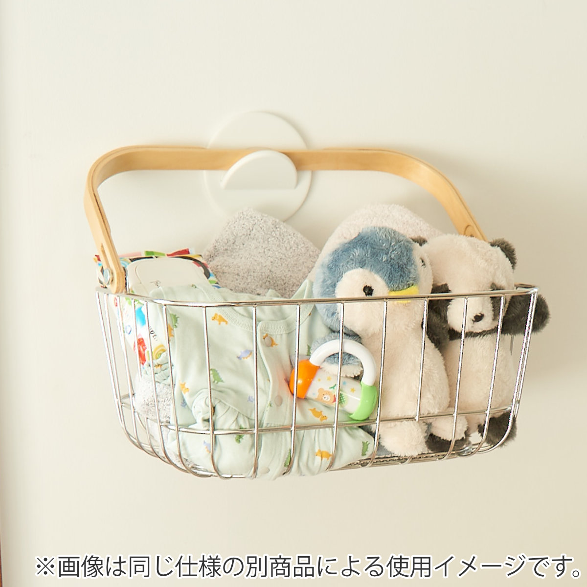 別売りのサークルフックを取付けることで、壁に収納することも可能です。壁に収納することで、バスケットを置くための棚が不要なのもうれしいポイントです。