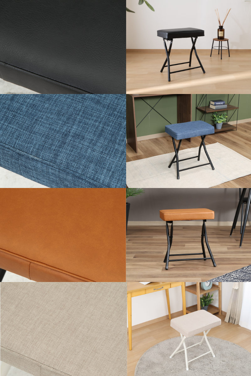 おしゃれな合成皮革(PUレザー)を使用したブラックとブラウン、耐久性に優れたポリエステル生地のブルーとベージュからお選びいただけます。