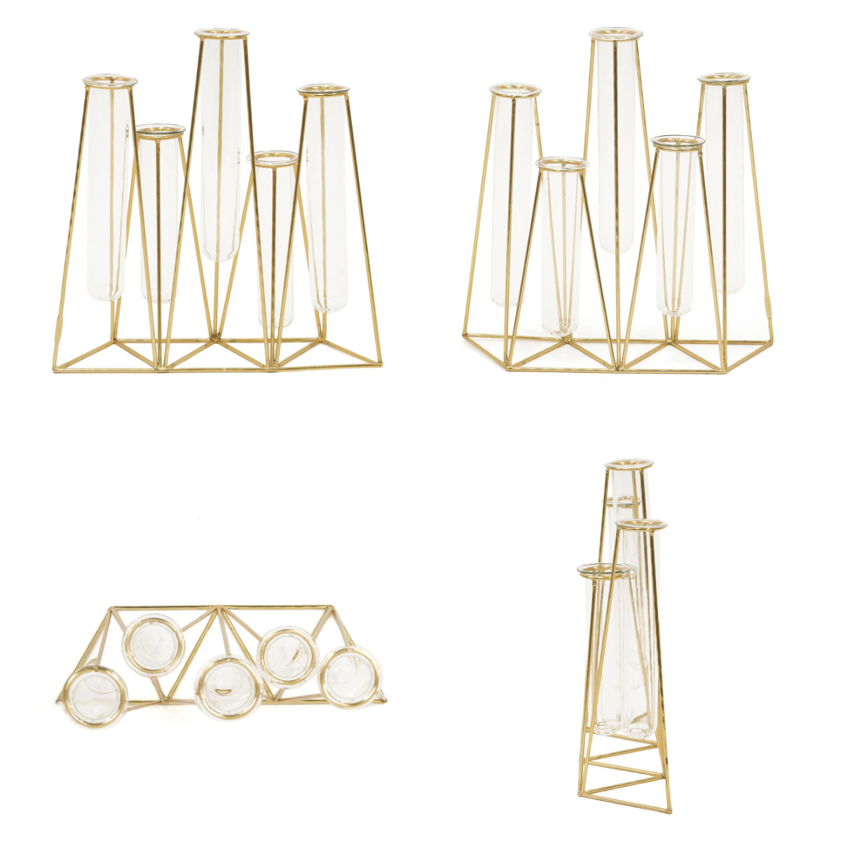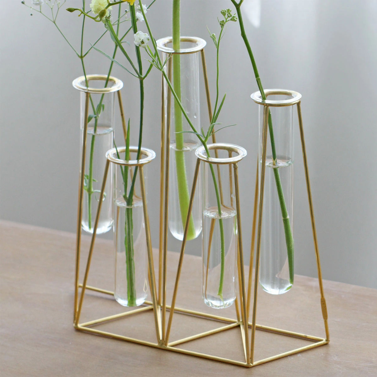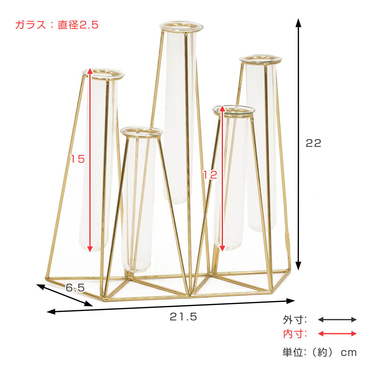 ゴールドのフレームとガラス管を組み合わせたスタイリッシュなフラワーベース5連です。一輪挿しが連なったようなユニークなデザイン。簡単にバランス良くお花を飾ることができるので、フラワーアレンジメントが苦手な方にもおすすめのアイテムです。