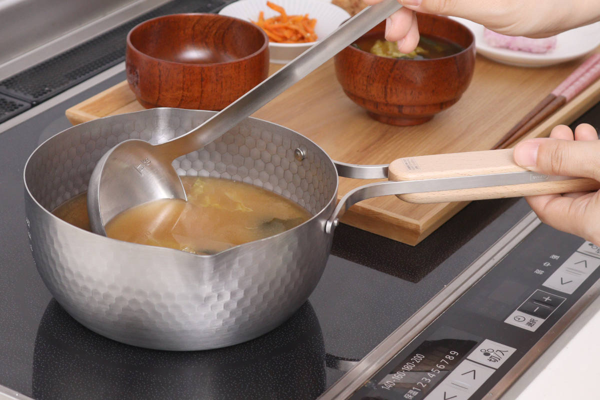 錆びに強いステンレスに丁寧に打ち出された、凹凸の槌目(つちめ)模様。見た目の美しさだけでなく、熱を効率よく伝える設計で、優れた保温性を発揮します。高い強度と耐久性を兼ね備え、日々の料理に品と深みを添える、永く愛される逸品です。