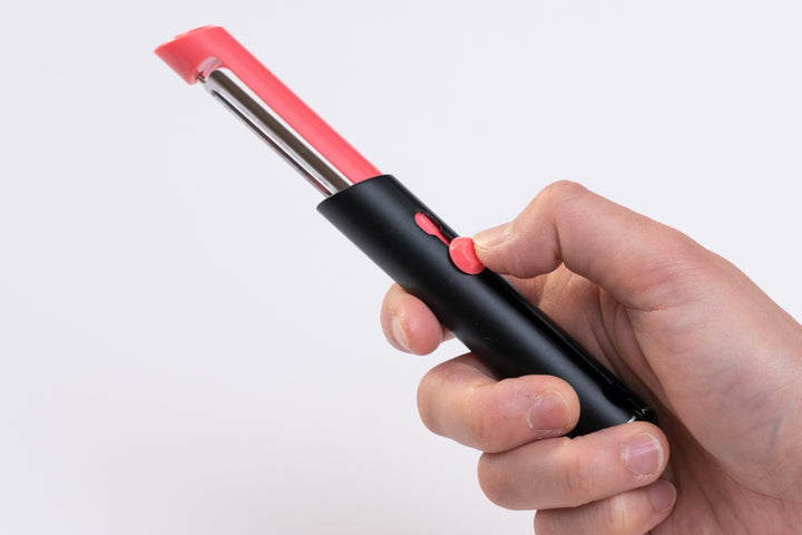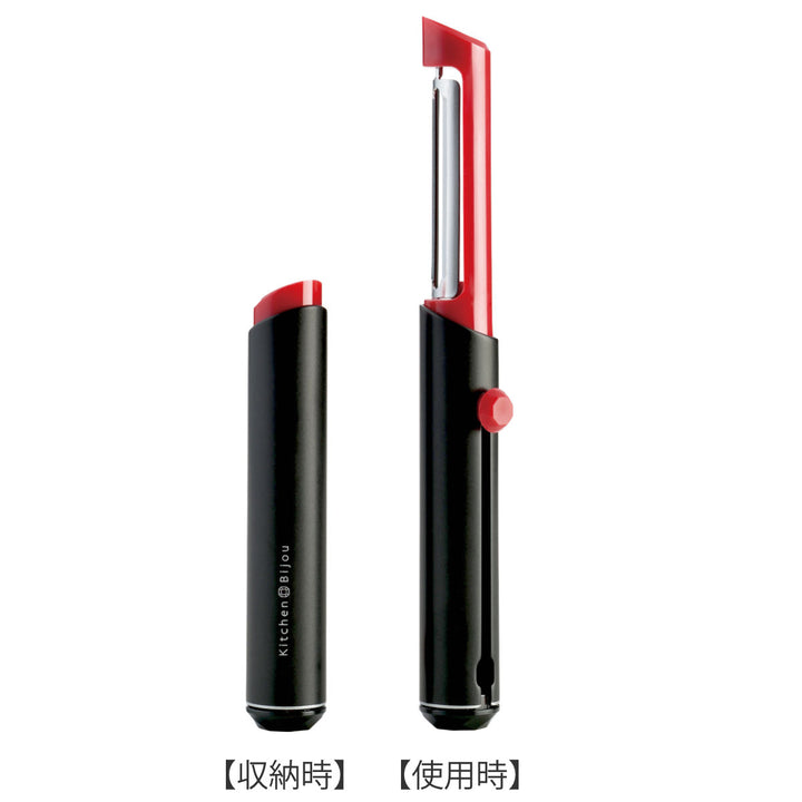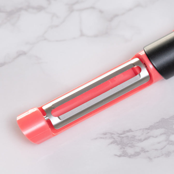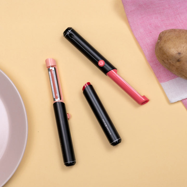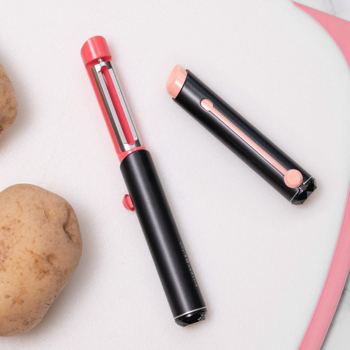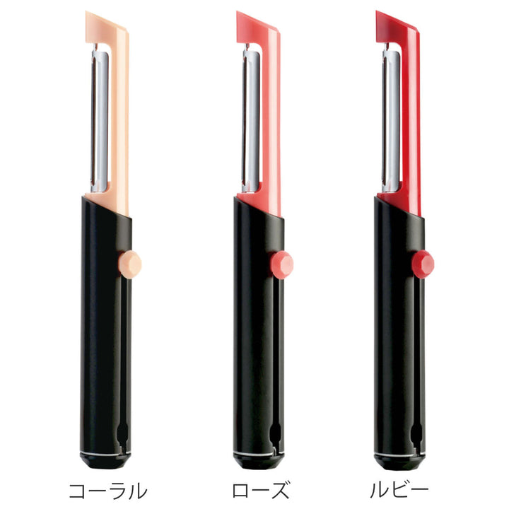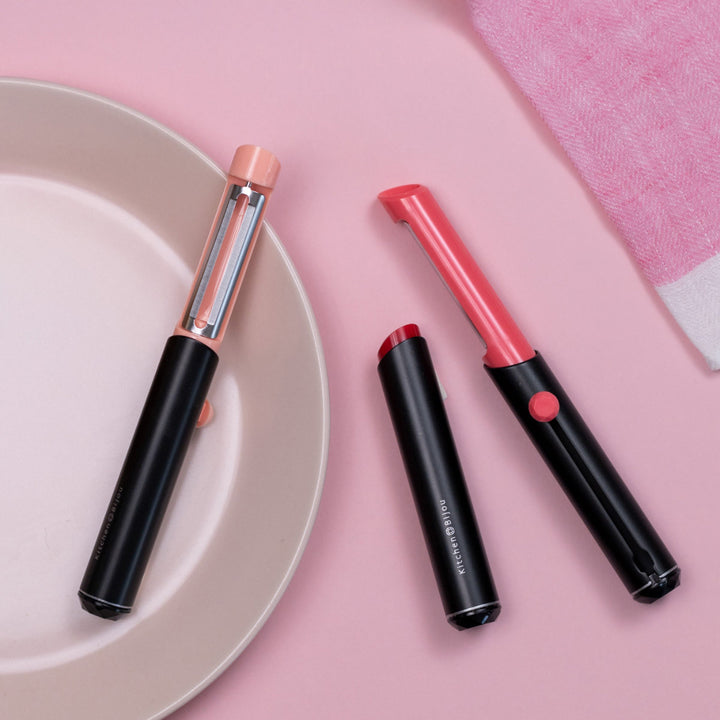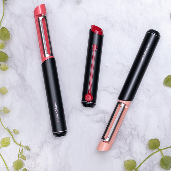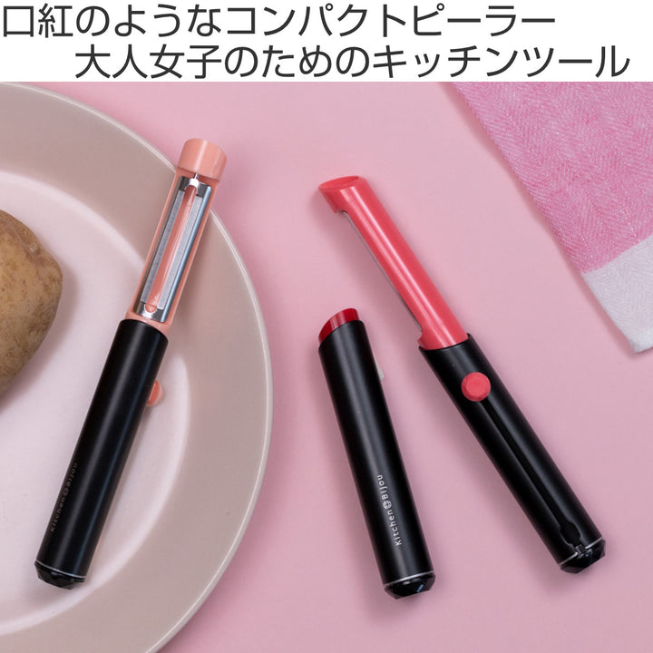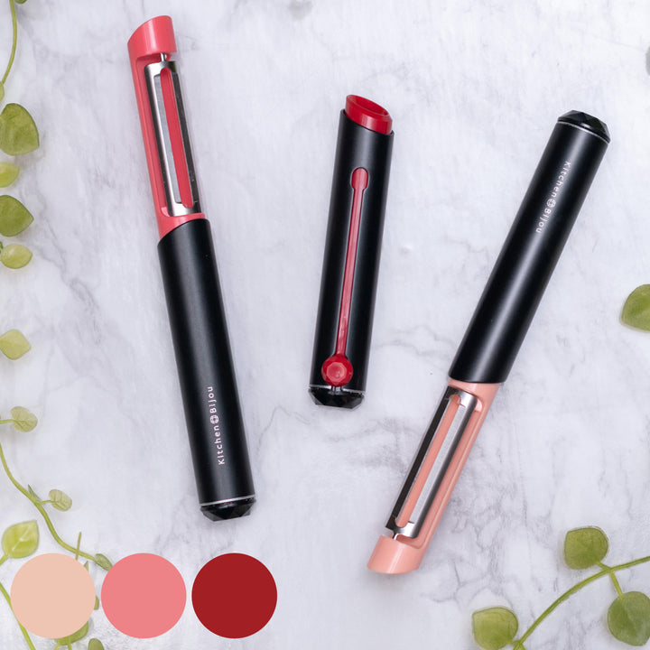 口紅のようなデザインのピーラーです。口紅のように刃を繰り出して使用します。コスメのようなフォルムで、使うのが楽しみになります。