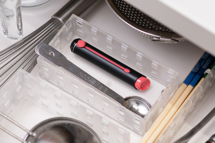 刃を収納させると、とてもコンパクトかつ安全に収納できます。収納時に手が刃に触れたり、他のキッチンツールを傷つける心配がありません。