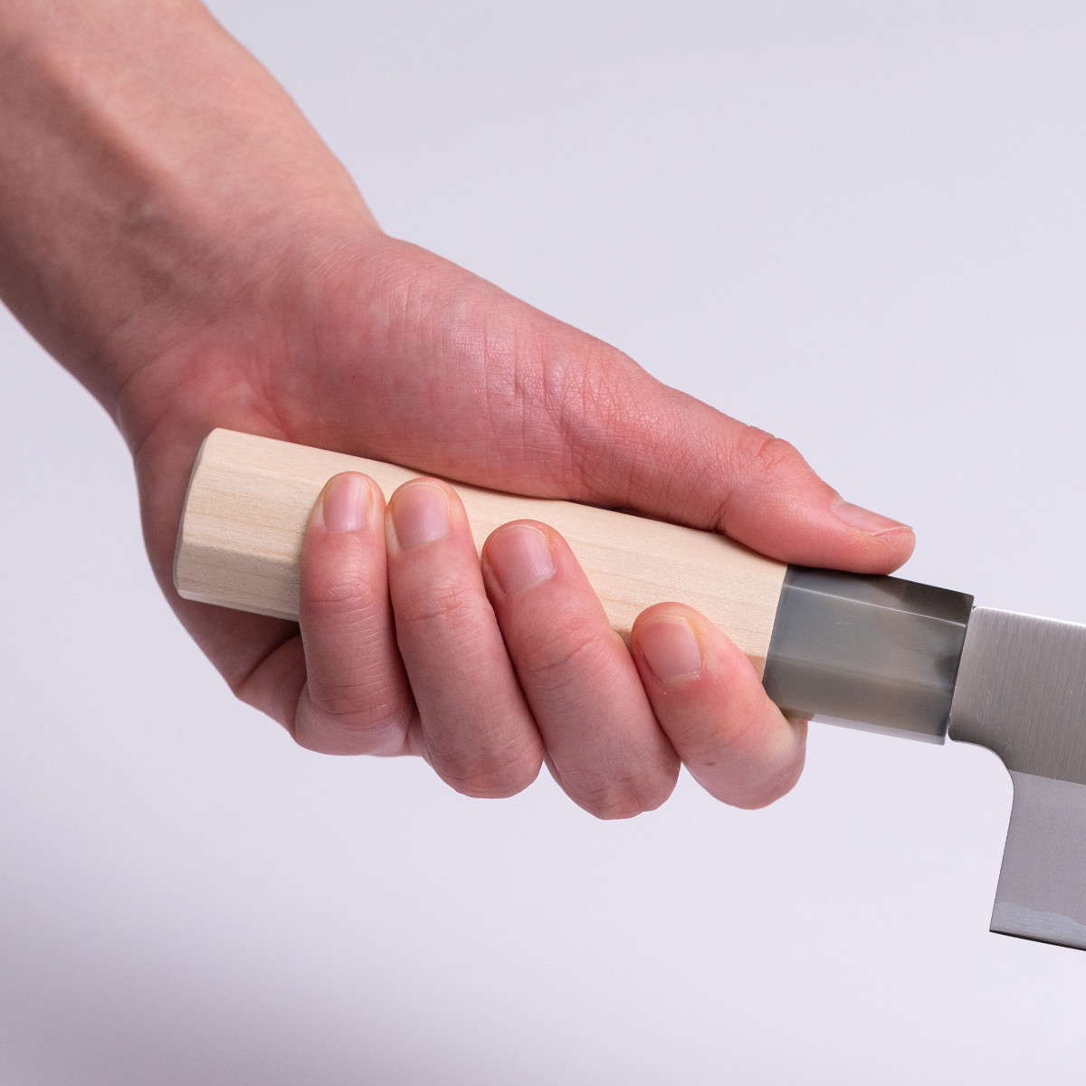 天然木を使用した、八角ハンドルの和包丁です。八角ハンドルは握りやすく滑りにくいため、手にかかる負担を和らげてくれるのが特長です。また、そのすっきりとしたフォルムは見た目にも美しく、シャープな雰囲気を醸し出します。
