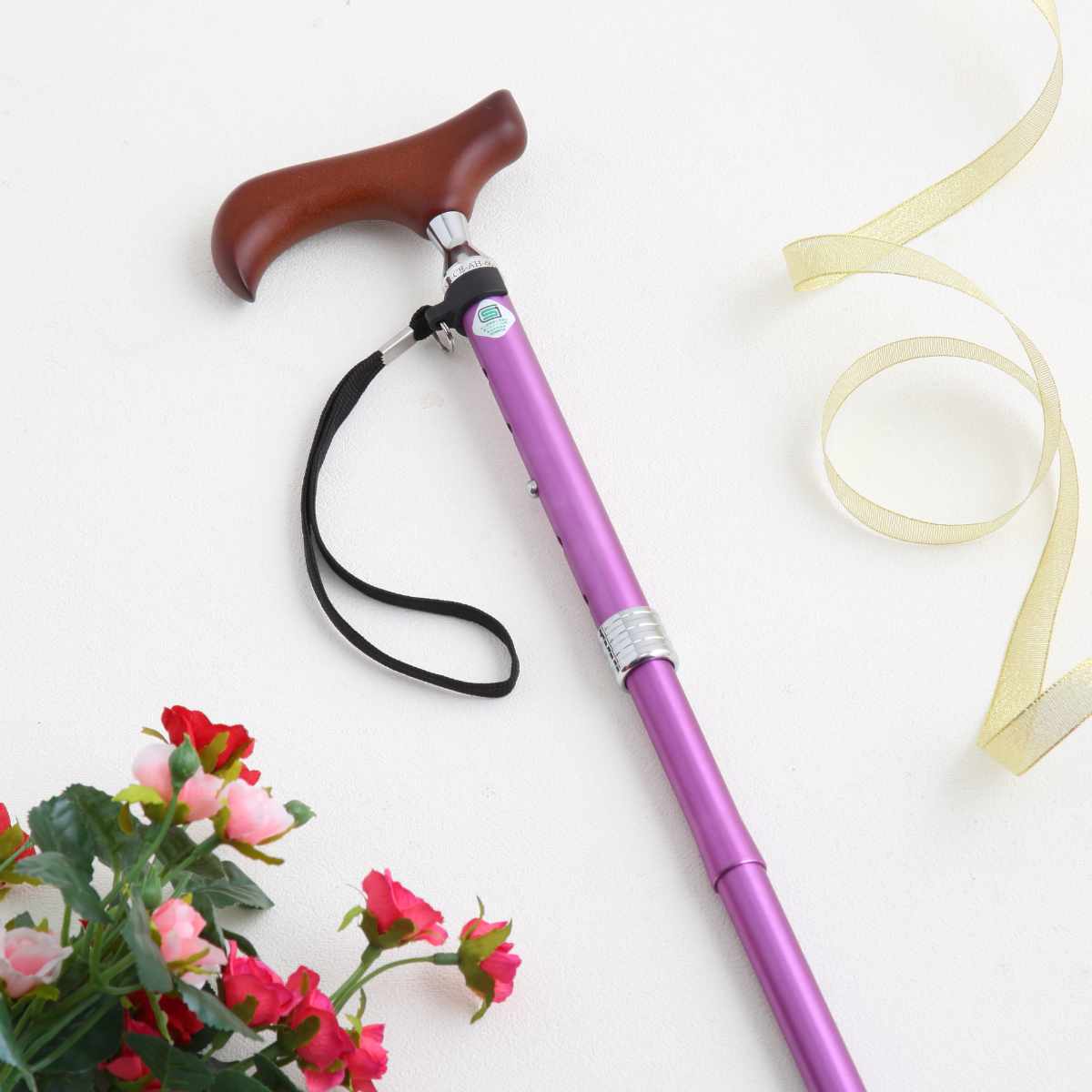 便利なストラップ付きです。手を離してもステッキが倒れず、拾う必要がないので便利です。ステッキを置き忘れたり、倒したりすることも少なくなります。