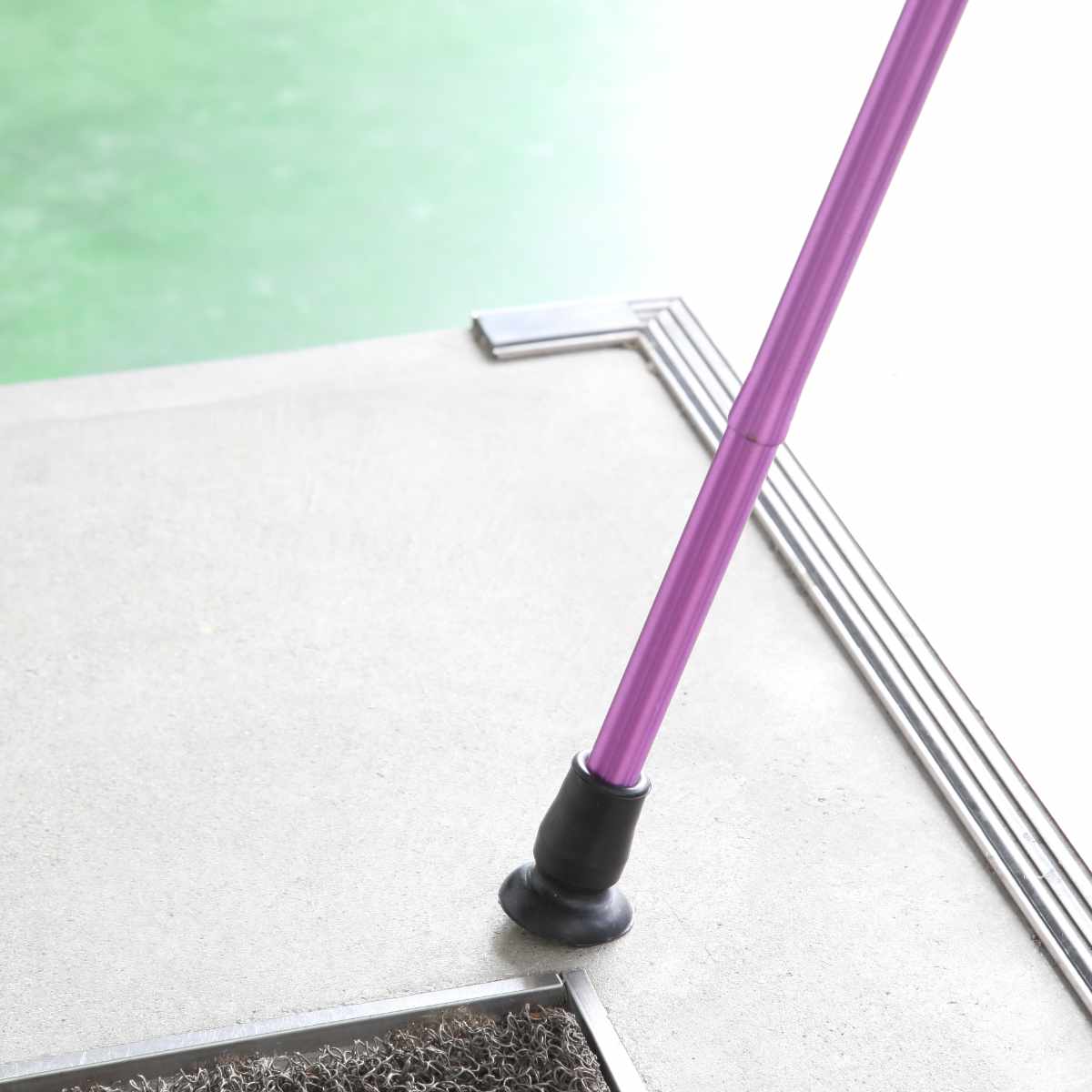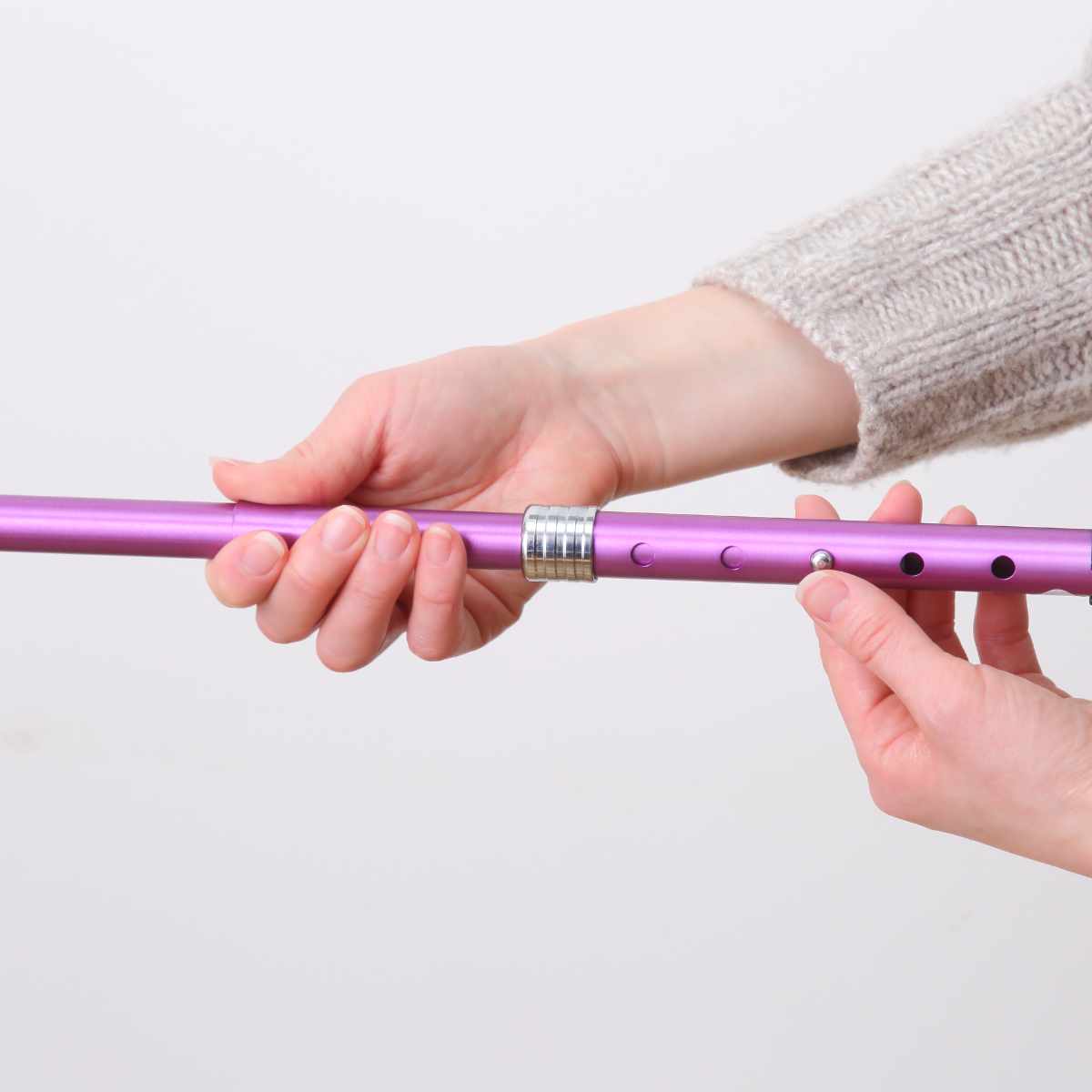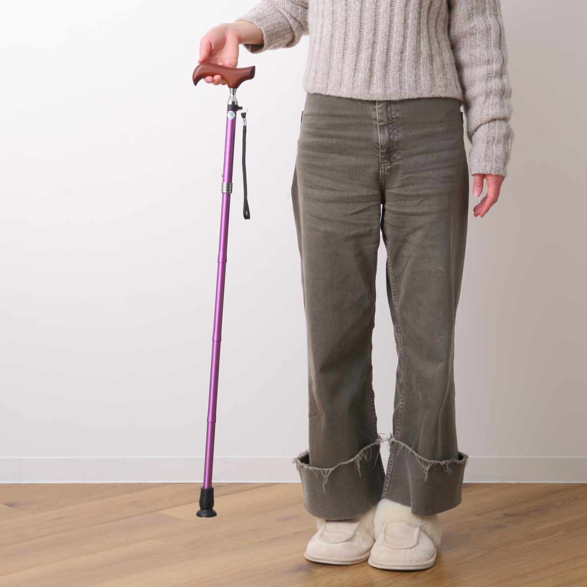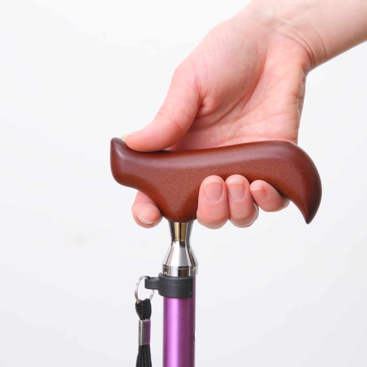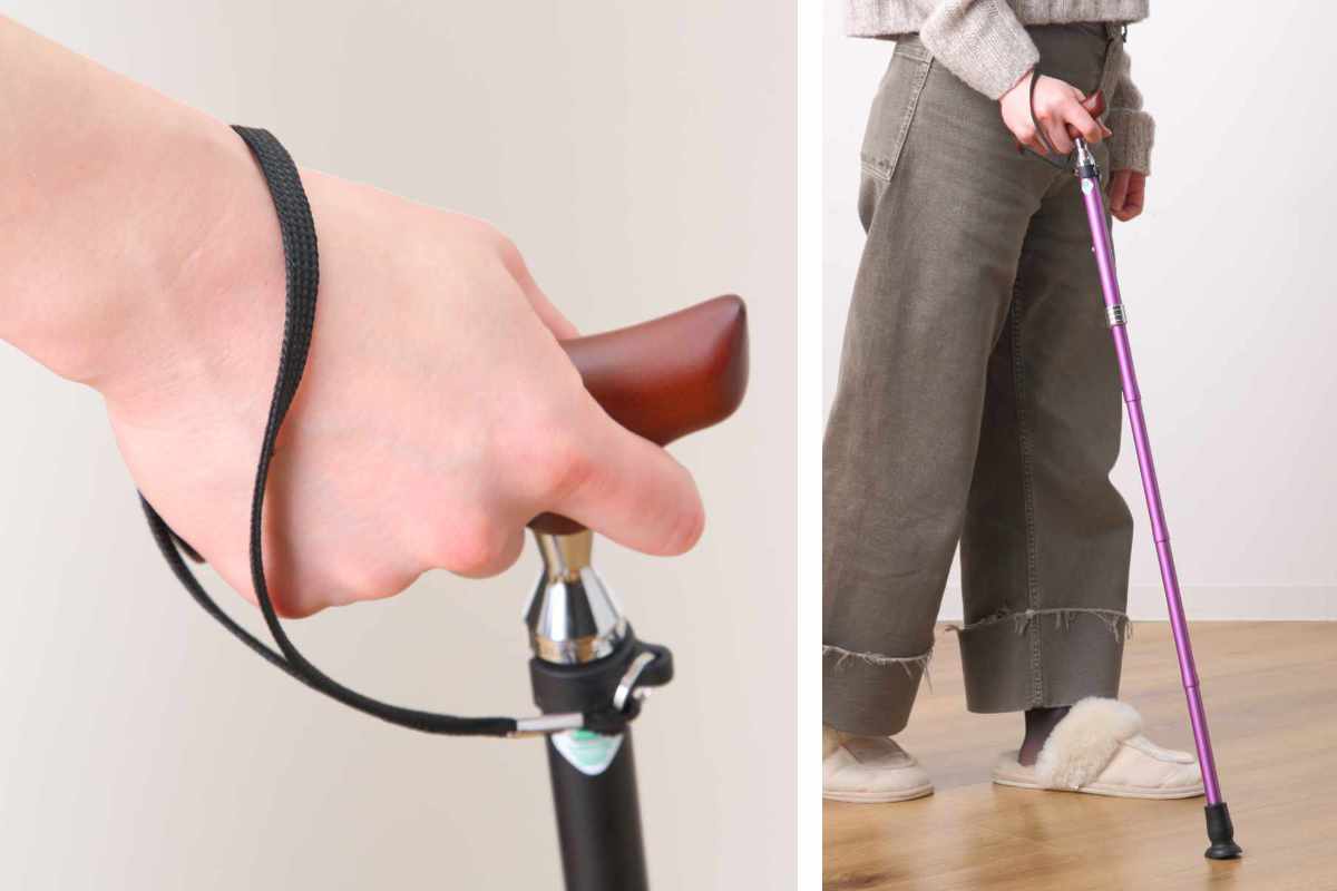 腕とステッキが一直線になるように持ってください。グリップの一部だけを握ると不安定になり危険です。